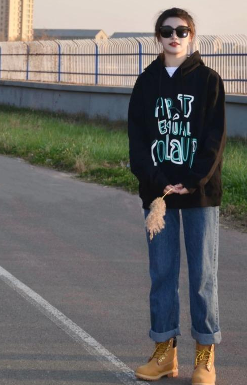 For the style of sweatshirt, try to choose this oversized style, that is The line of the hem is a straight line and the style is loose. The effect of this kind of wearing is relatively refreshing, and the line on the belly is relatively straight, which can well collect the waist and hips and make it look slimmer.