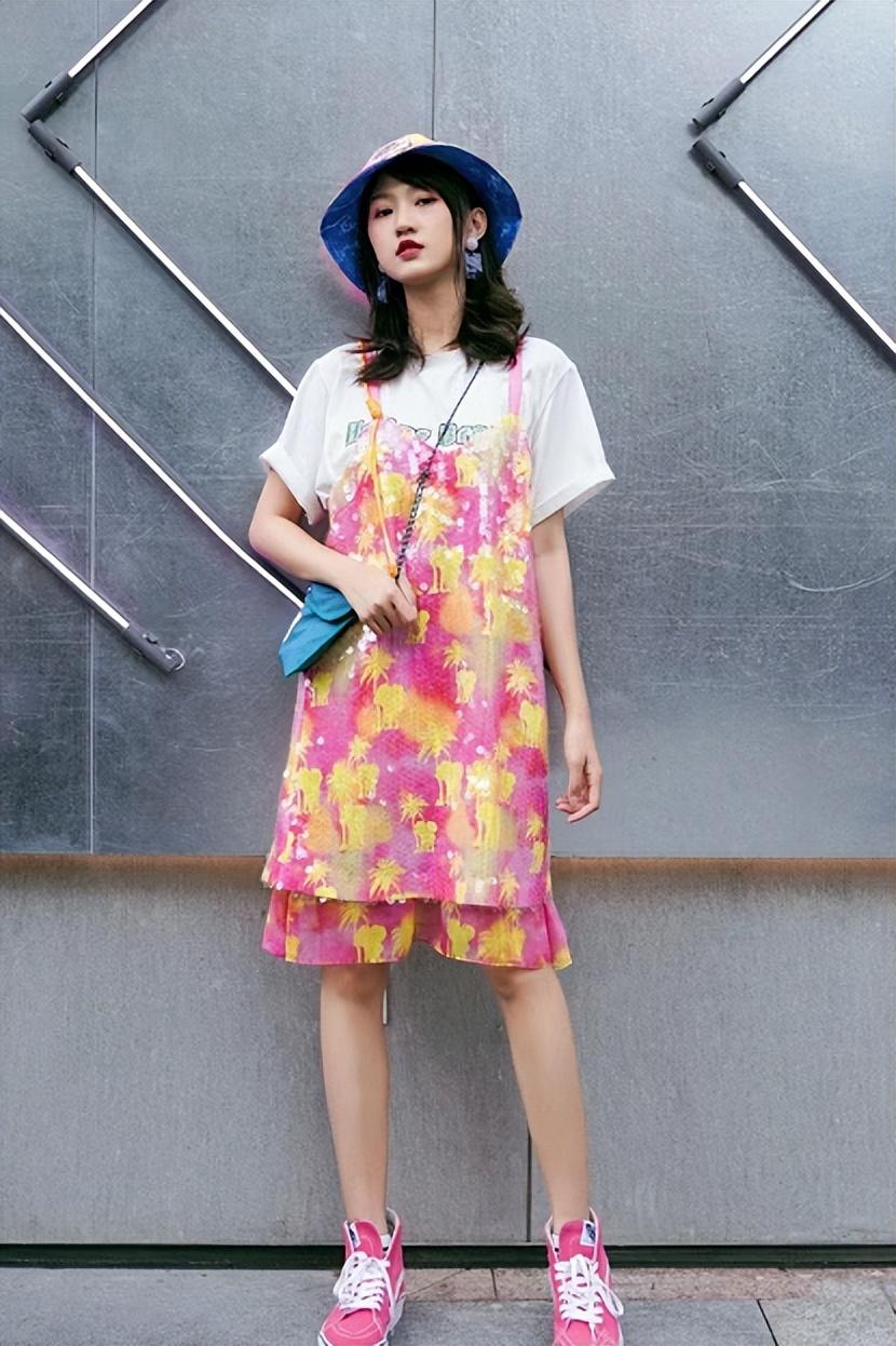 When using a combination of T-shirts and dresses, we can decide the order of the layers according to the pattern design of the skirt. If the skirt we are wearing is relatively slim, we can wear the T-shirt outside and use the loose design of the T-shirt to add a certain casual charm to the overall look, neutralize the sweet atmosphere brought by the skirt, and make the look look More unique personality.