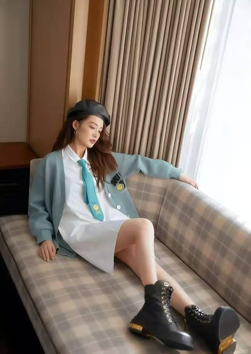 What kind of fashion effect will a soft and feminine knitted cardigan look like when combined with a crisp white shirt? Look at Li Qin’s blue suit. Just look at the look of a knitted cardigan paired with a white shirt. It not only combines gentle style with smart style, but also gives people an eye-catching and stunning feeling. Wearing it like this when going out on the street will definitely make you turn heads and become the focus of the street.