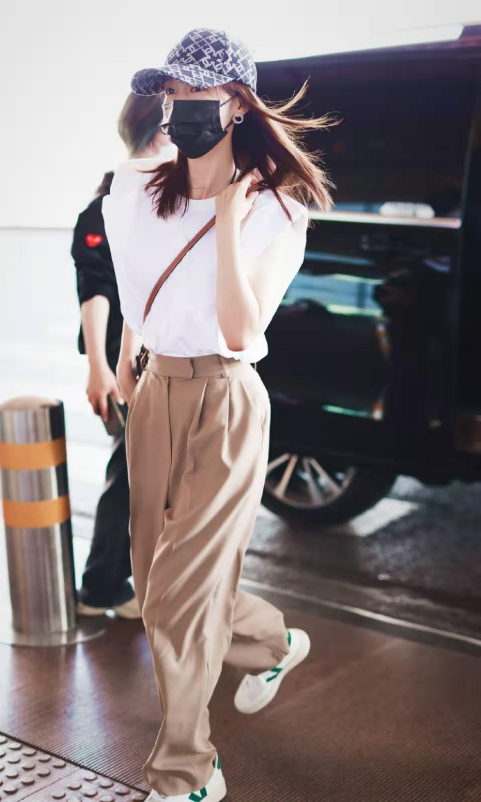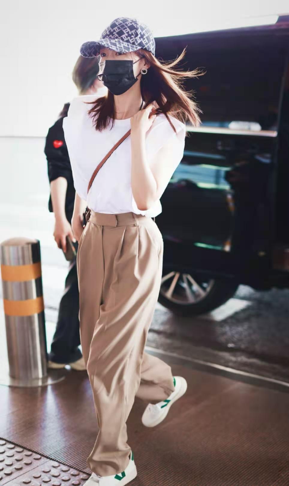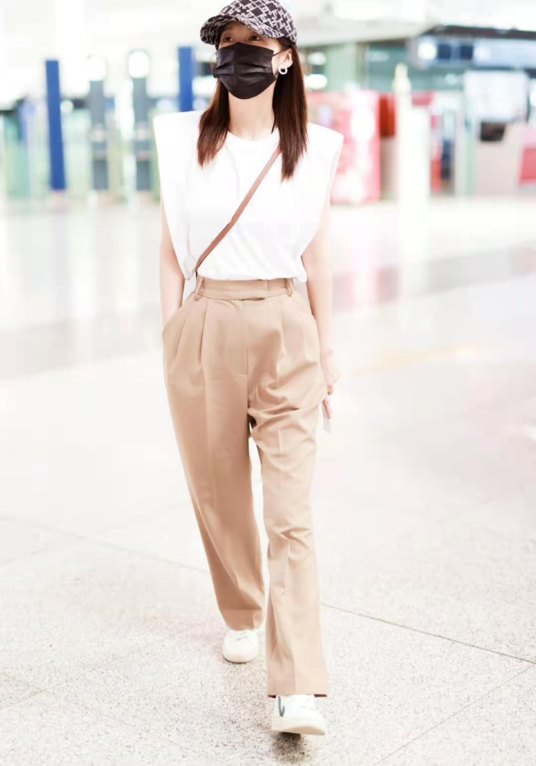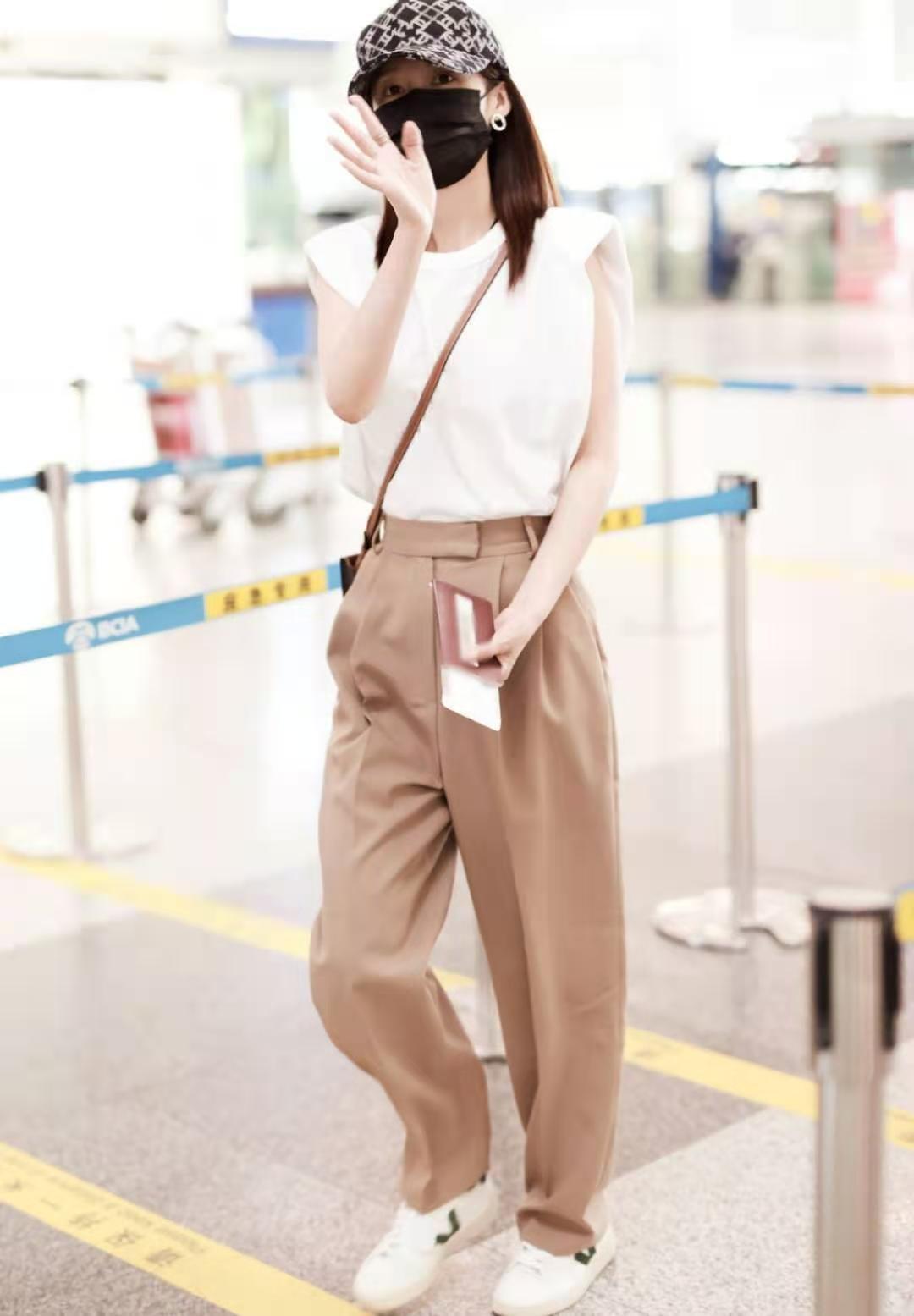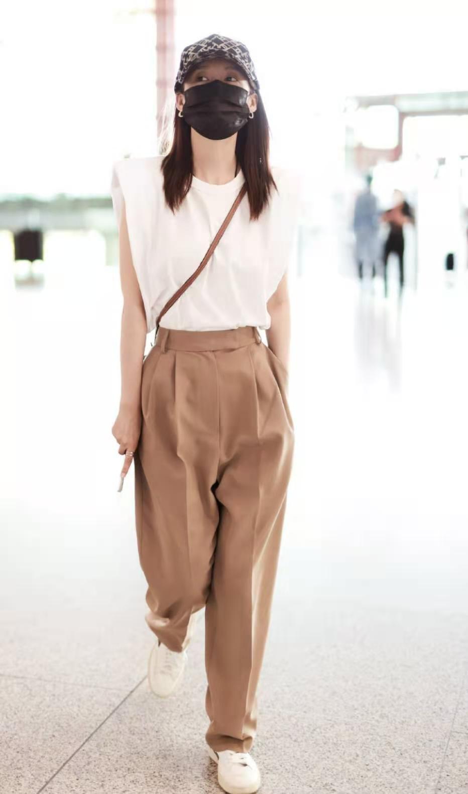 Li Qin’s sleeveless T-shirt is white and the pants are khaki. This color combination explains to us what contrasting color matching is, which is probably a color combination of “white + khaki” with great contrast.