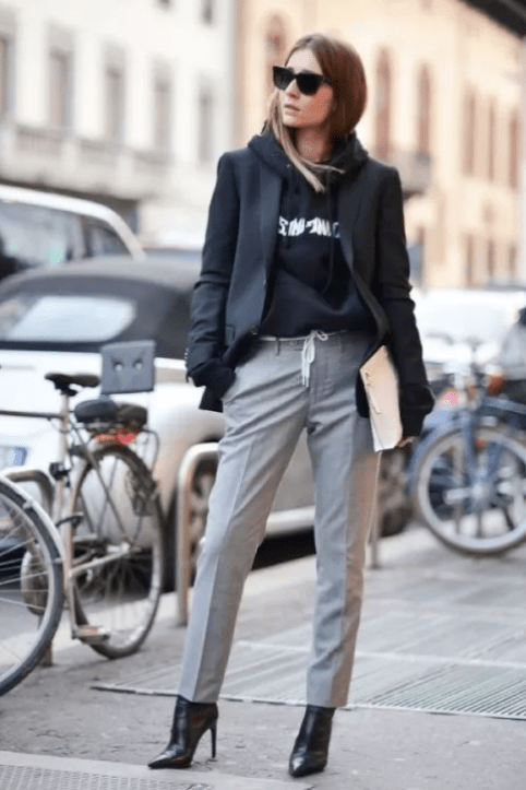 Either pair it with shorter trousers or skirts, or fold the trousers. Showing off the style can make Chelsea boots have more of its own style. Of course, your temperament will also be contained in it. Like this white sweatshirt paired with high-waisted black pleated trousers, the top is wide and the bottom is slimmed down and looks good.