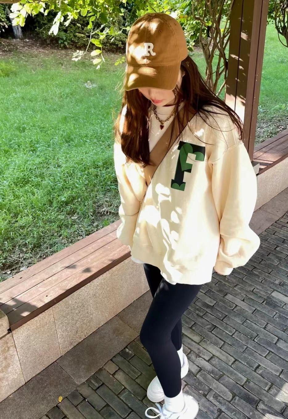 Another example is this “beige sweatshirt + leggings” look. Only a brown baseball cap makes the whole look stylish.