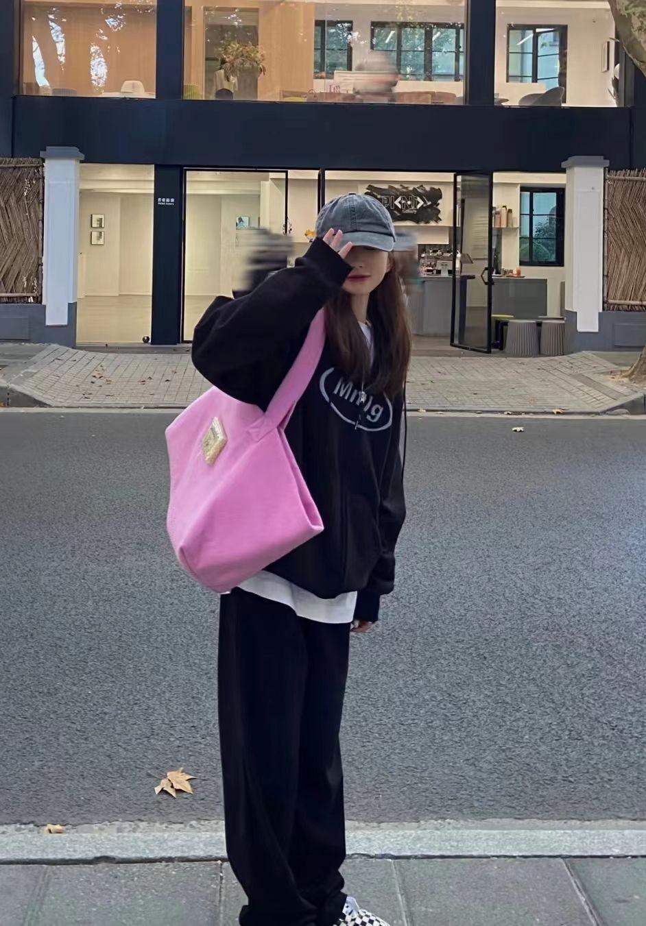 Even a black sweatshirt paired with black wide-leg pants still has fashionable charm.