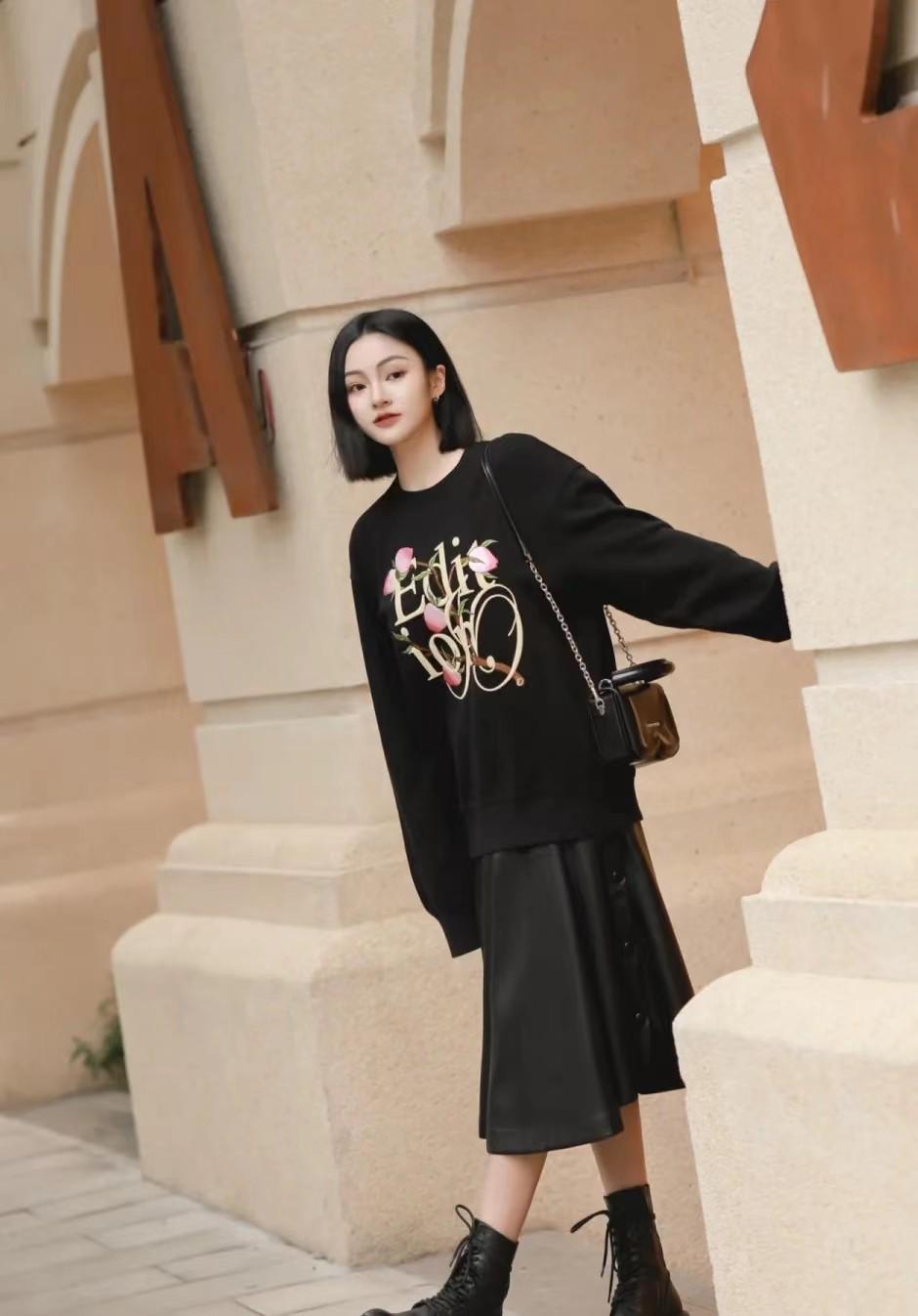 If you are worried about the conflict between sweatshirts and leather skirts due to different styles, you may wish to learn from the blogger above and match them with leather skirts Sweatshirts of the same color use color consistency to promote a sense of coordination in the entire look.