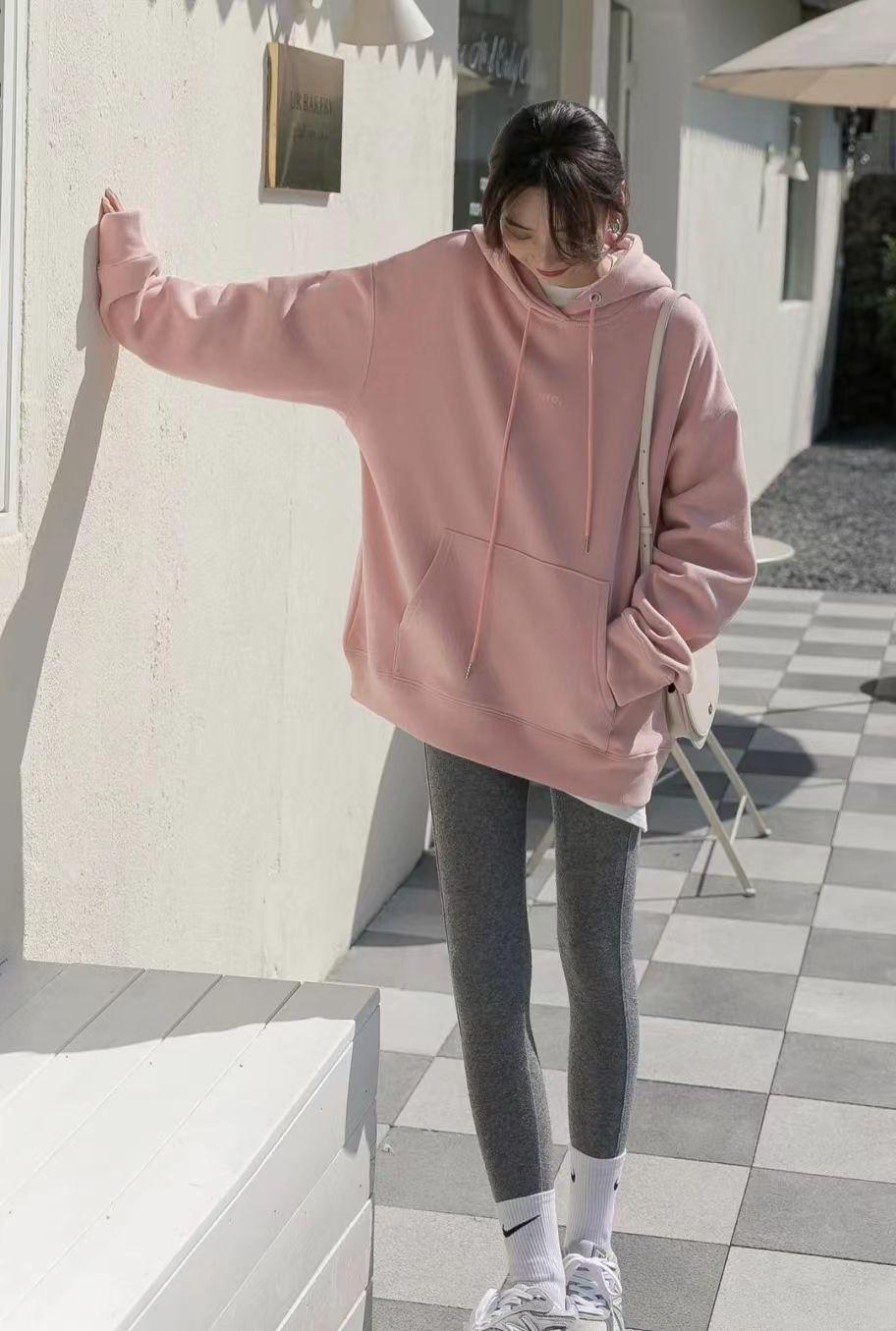 For example, in this “pink sweatshirt + leggings” look, layer a white T-shirt under the pink sweatshirt to say goodbye to the tackiness. It also gives people a girly atmosphere with good breasts and cute breasts.