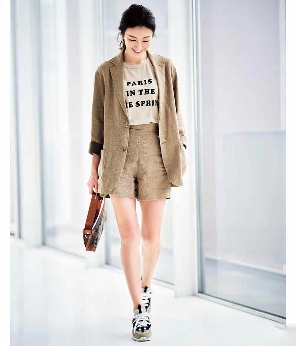 For women with straight and slender legs, you can also try these high-waisted shorts to match a suit and a printed letter T-shirt. The shorts are The trouser legs have an everted design, which can better highlight the slenderness of the thigh lines. Paired with thick-soled sneakers, they can increase height and lengthen the legs.