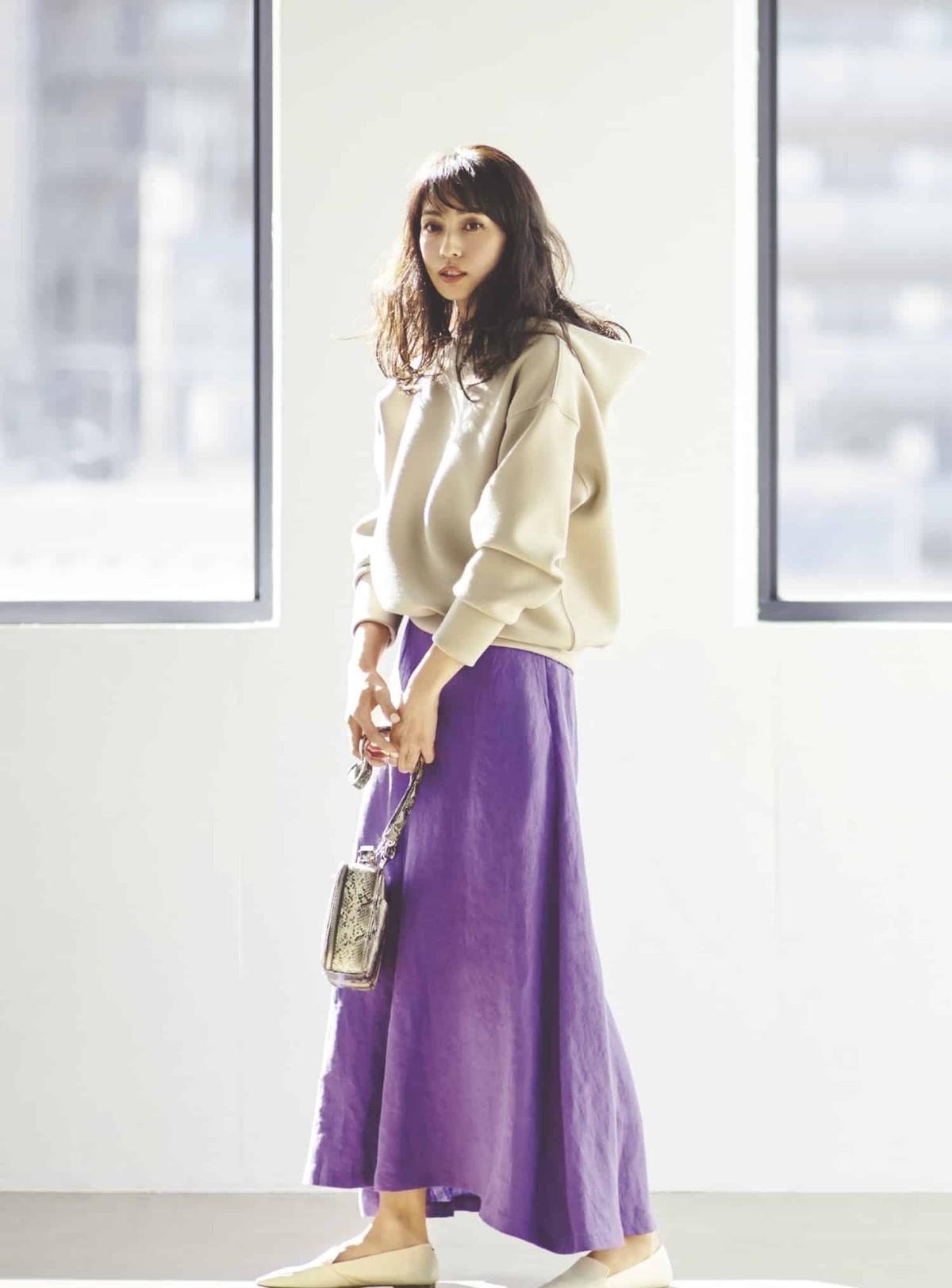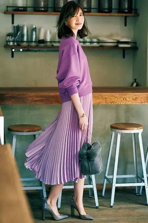 For example, use a beige sweatshirt to match a purple skirt. One of the two colors is a basic color, and the other is an exaggerated high saturation. As for color, purple will become the embellishment color of the overall match, breaking the dullness of the color, but the beige sweatshirt will appear low-key and deep, and will not make the match too exaggerated, so this matching style is complementary.