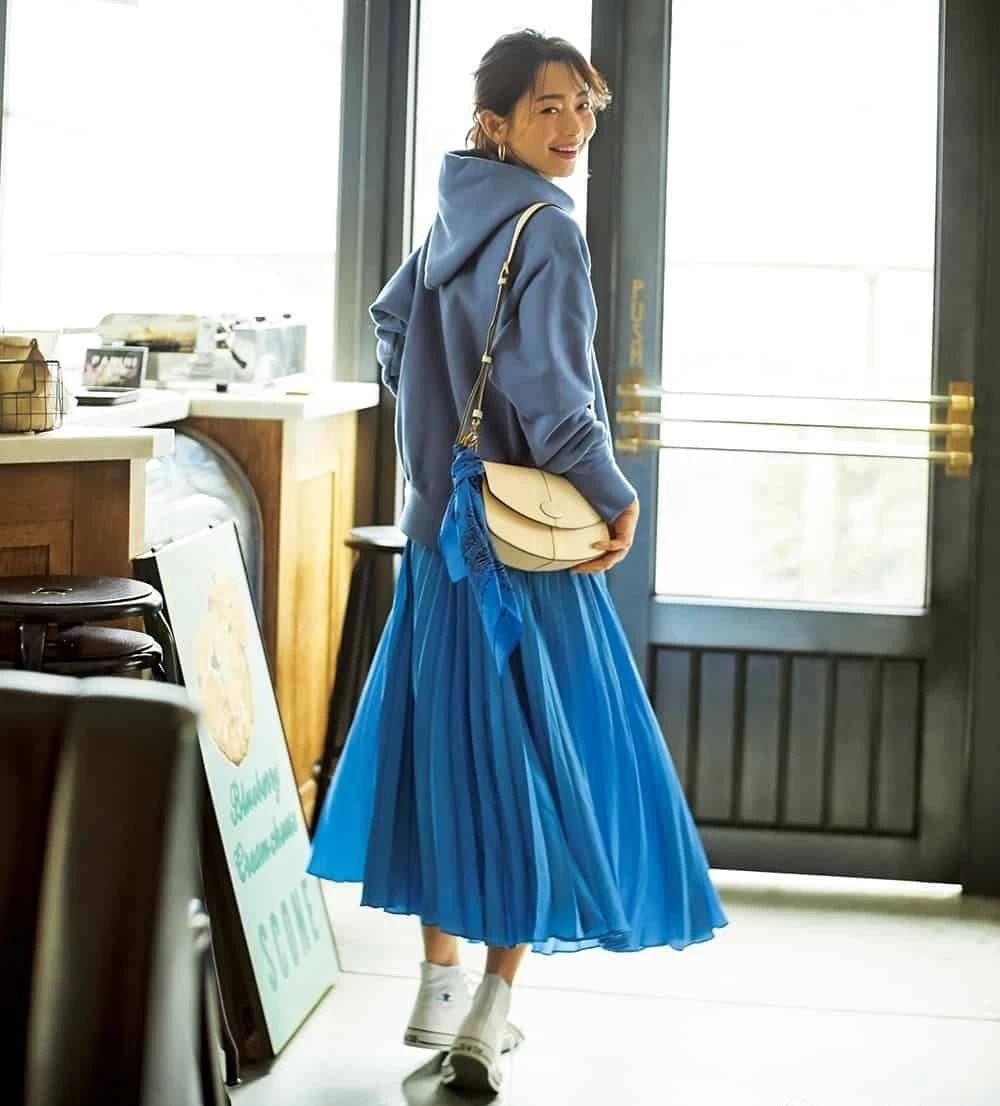 This matching method looks very ordinary, but it can make the dressing style look very textured. For example, using a blue sweatshirt with a blue half-body Skirts, between two colors, can show different shades of effects, making the colors look very layered.