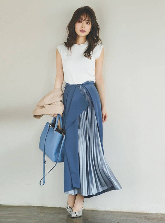 This haze blue long skirt looks unusual in design. It uses double-layered fabric to highlight the design. , adding lustrous pleated fabric to the inner layer, and matching the haze blue matte fabric to the outer layer, creating a patchwork effect. The overall tailoring style is quite abstract, paired with a pure white sleeveless T-shirt on the upper body. It forms a combination of traditional and simple, elegant and refreshing.