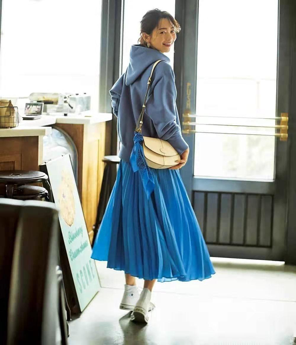 The artistic and fresh azure blue skirt is gentle and elegant when worn, paired with a gray-blue hooded sweatshirt, showing a fresh and elegant look. With a vibrant personality, she wears a pair of white high-top canvas shoes on her feet, which injects a youthful and energetic atmosphere into the overall look.
