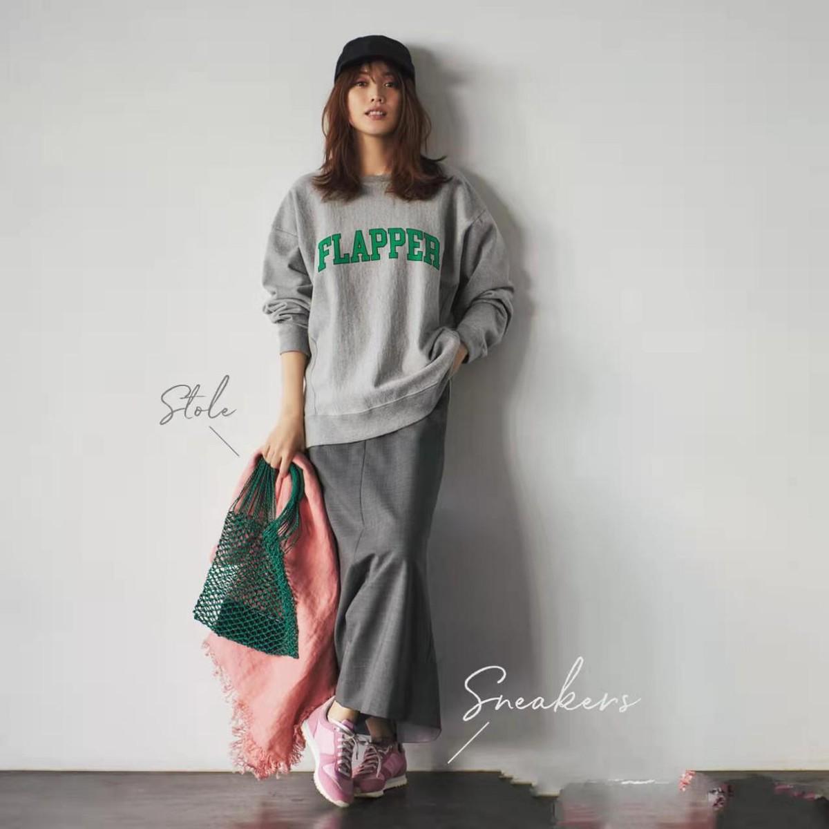 Matching with the same color It must be the most classic and eye-catching, and the matching is effortless. If you want to go out quickly, wear it like this. The light gray printed letter sweatshirt is paired with an over-the-knee skirt of the same color. The overall combination is both elegant and energetic, and it is very age-reducing.