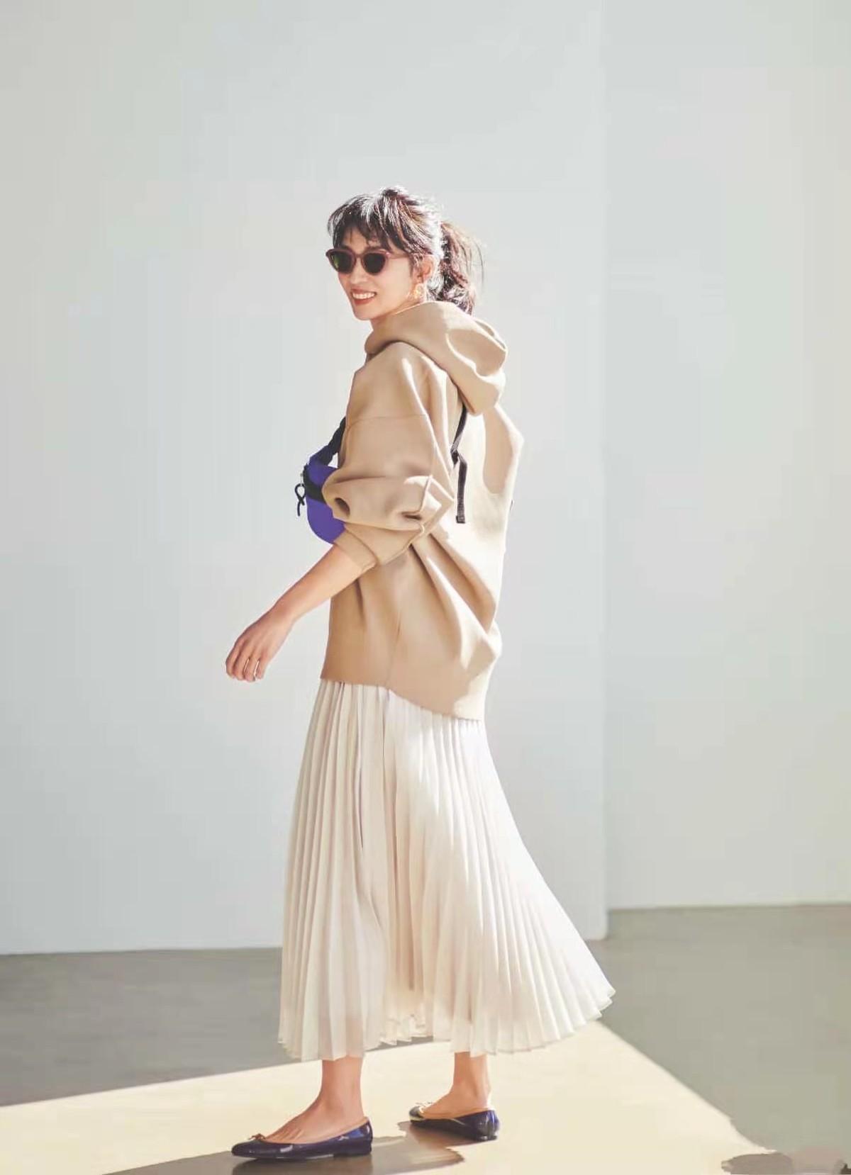 The romantic and light pleated gauze skirt is a single item favored by many girls. The less dense pleat design greatly enhances the gentle and fresh attributes of the pleated skirt. It can be paired with The hooded sweatshirt in the same color shows gentleness and vitality.