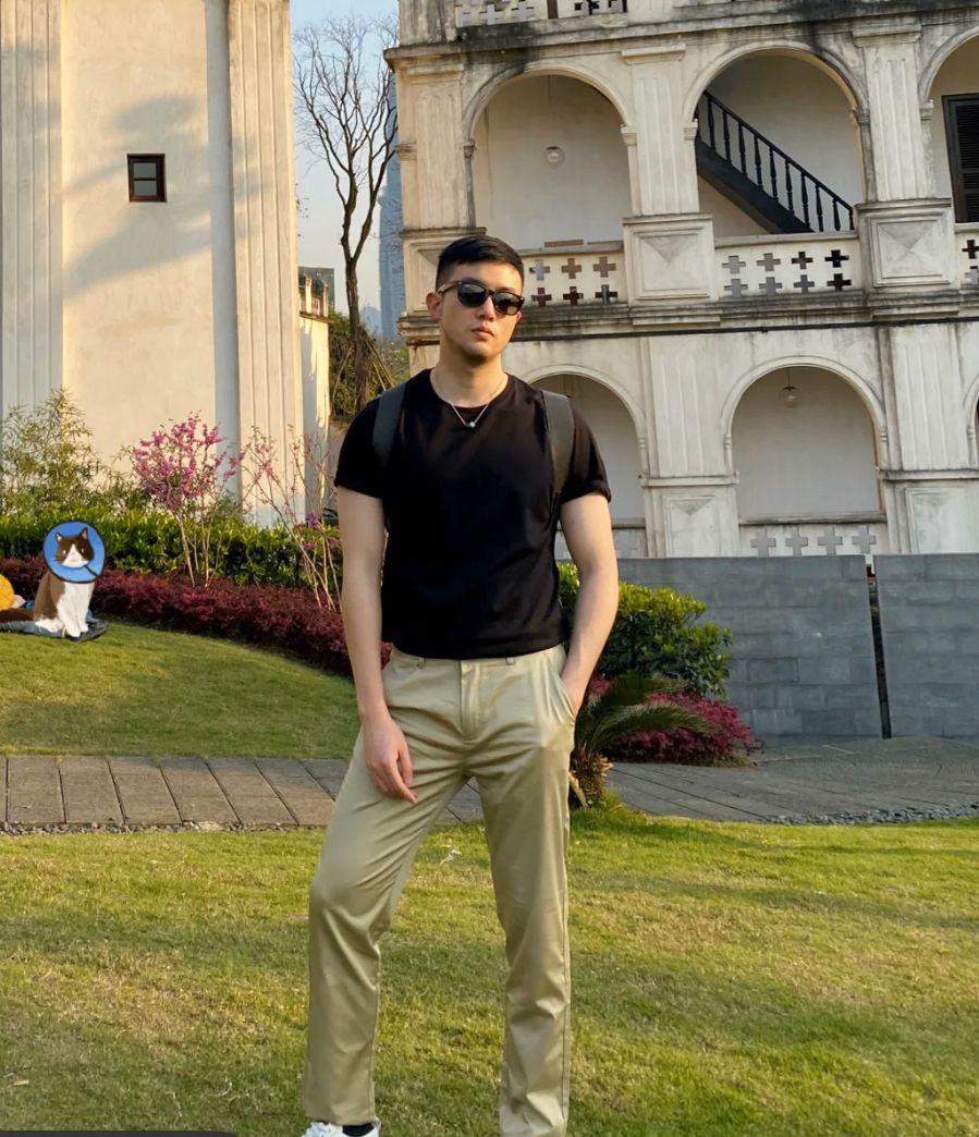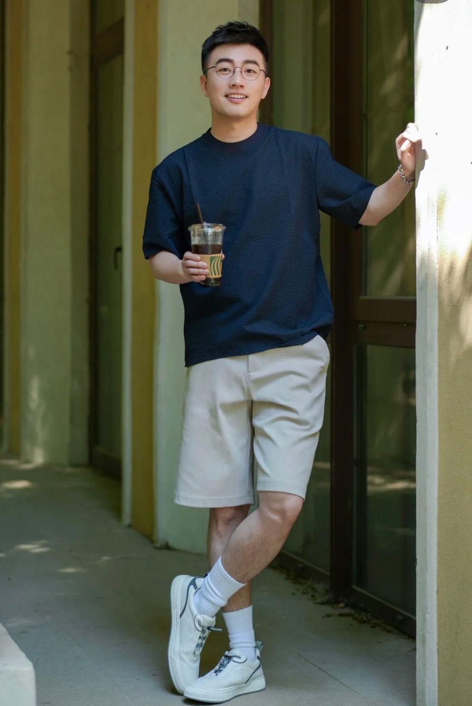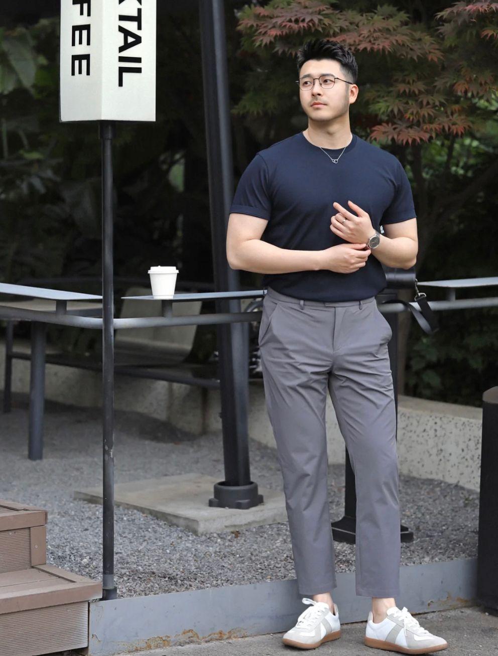 The combination of a navy blue T-shirt and khaki trousers adopts a “dark at the top and light at the bottom” color scheme Formula, This combination is light and comfortable, not bulky, and can also achieve the effect of slimming.