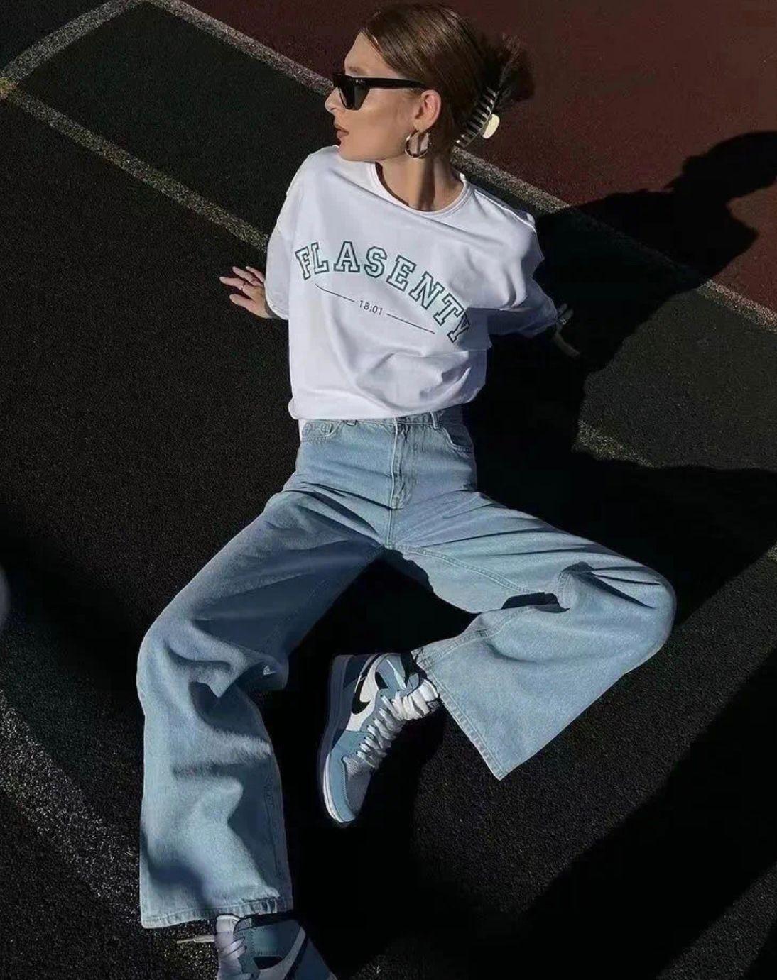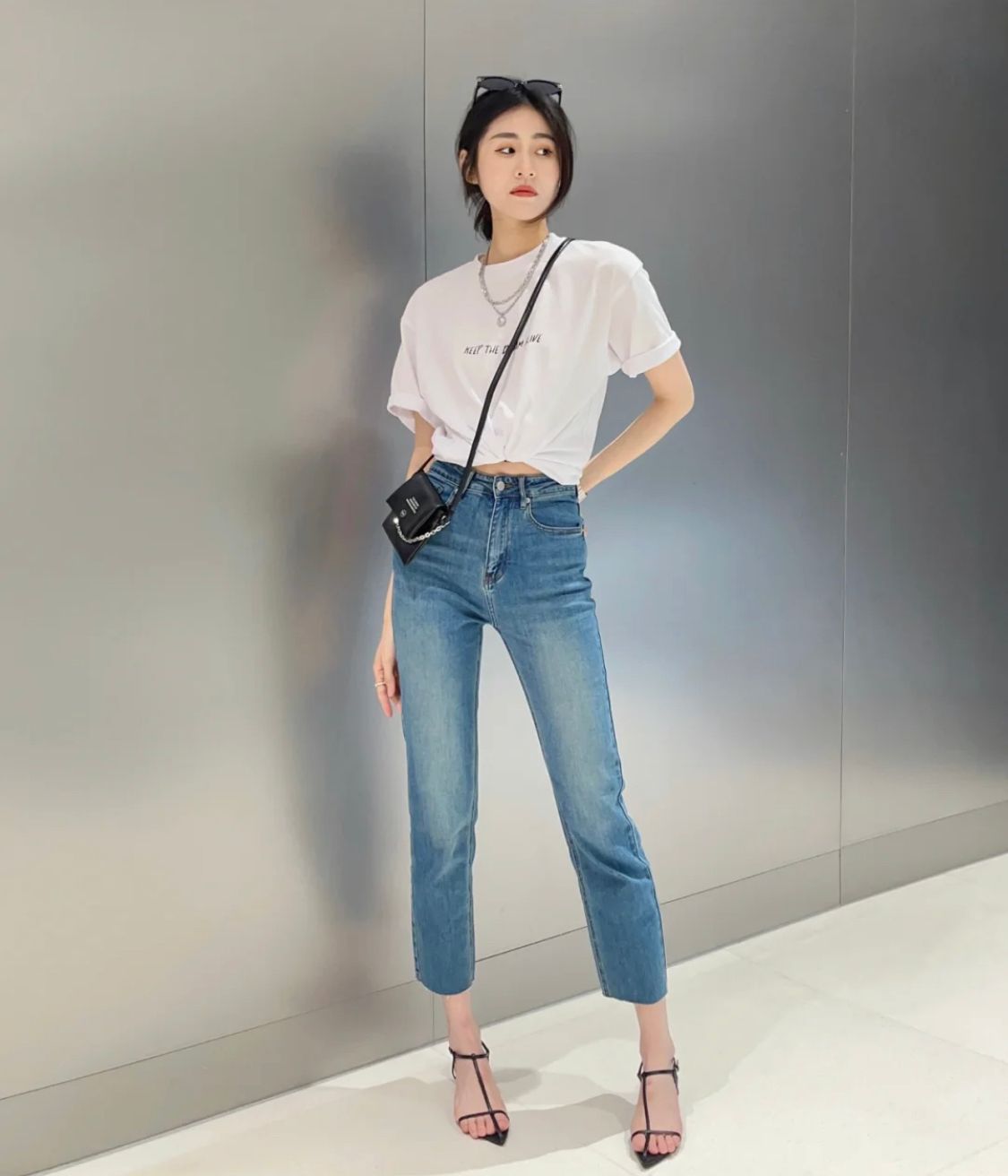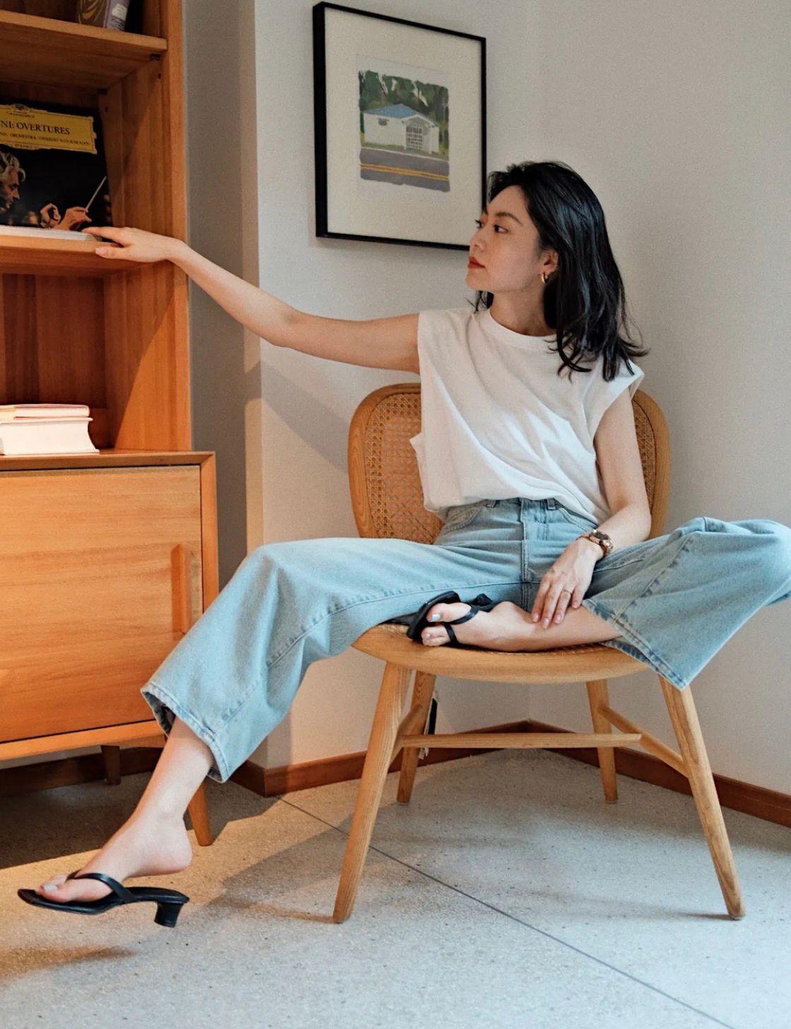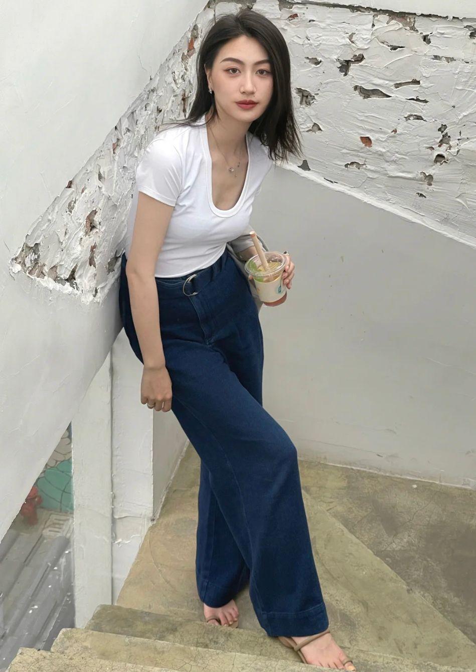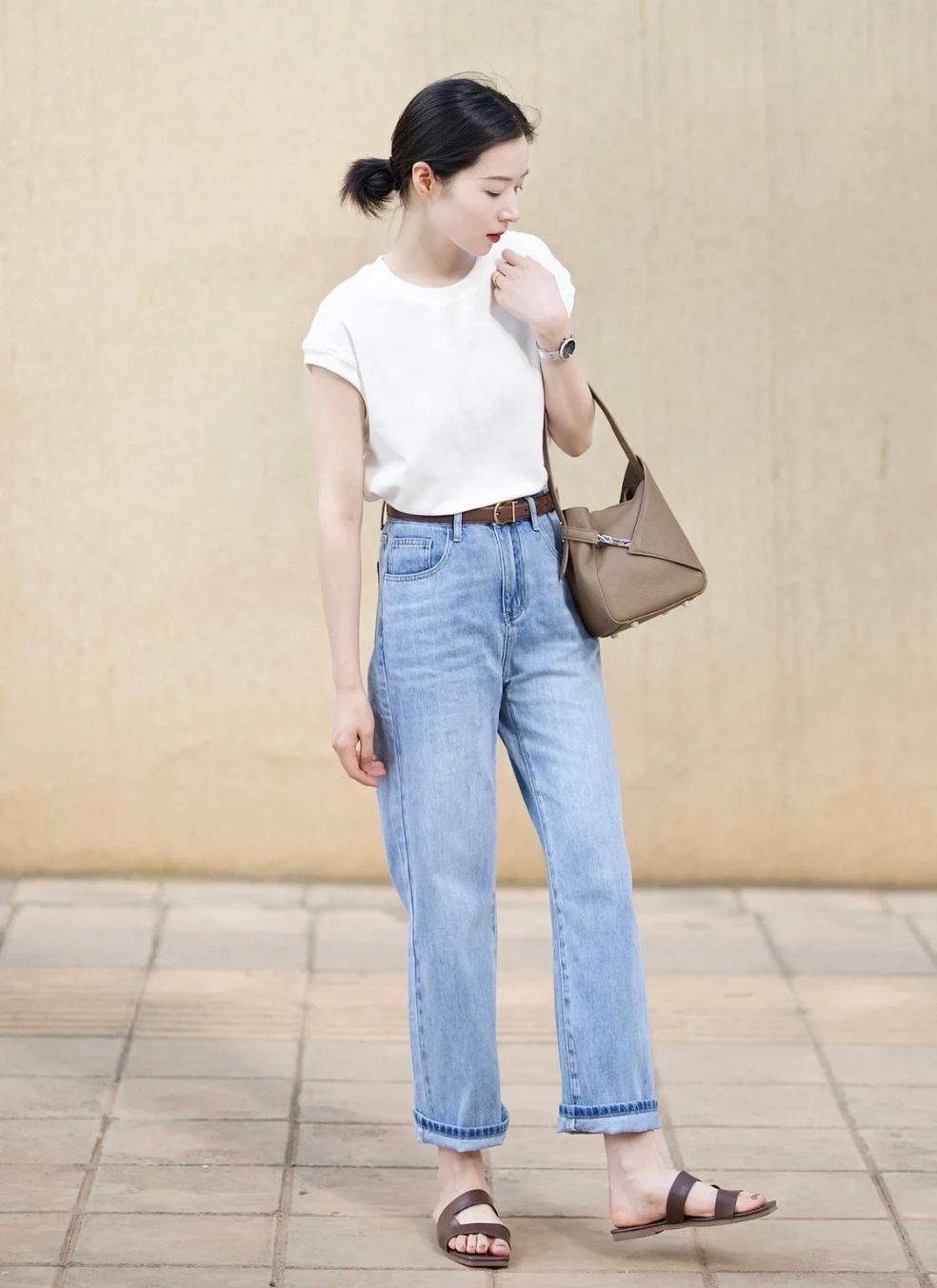 In addition to choosing high-waisted jeans and tucking a white T-shirt into the jeans, you can also pair it with a black or brown belt. Strengthen the waist line. Whether it is wide-leg pants or straight-leg pants, they are very suitable for matching with belts. However, under this premise, your white T-shirt must be loose, so that the effect of the belt will be obvious, otherwise it will look old-fashioned. And tacky effect.