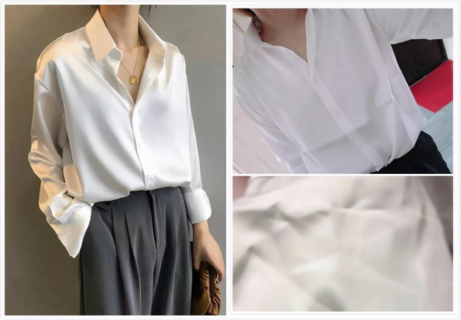 This white shirt looks like heavy silk, but the actual material is imitation silk like the picture on the right. It easily generates static electricity, is not breathable and has no texture. Such clothes are useless when bought, even if you don’t choose the fabric. Style doesn’t mean you can wear low-quality fabrics.