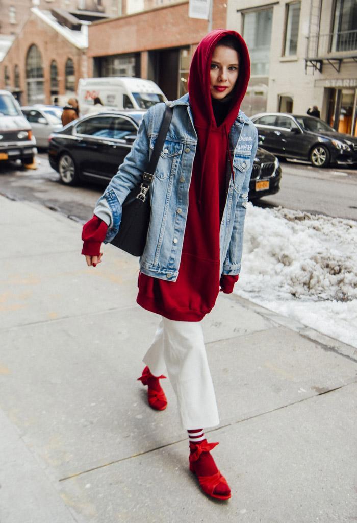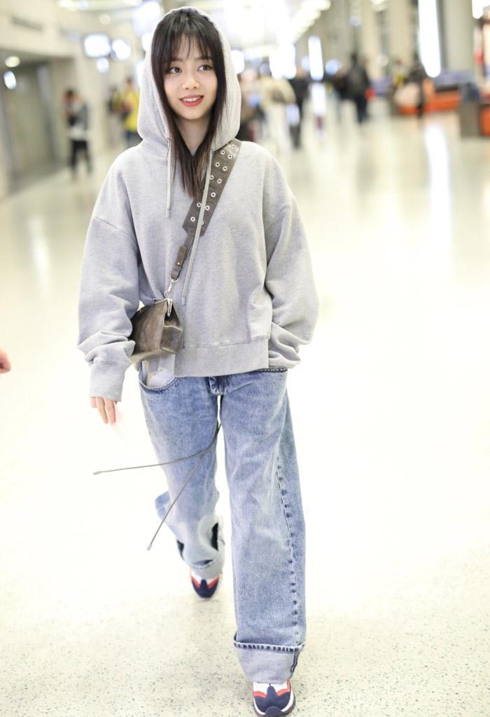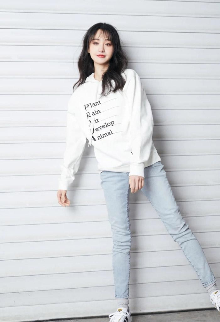 In addition to the common black leggings, denim leggings also go well with sweatshirts. The classic denim fabric is stiff and stylish, which can give the overall look a good look. The body is paired with more street elements. However, the elasticity of the denim fabric is not very high, and the fit of the pants is tight, so girls who are not slim enough should not try this item. A tall and thin person like Zheng Shuang is very suitable for wearing denim pants. Paired with a white printed sweater, he looks more refreshing. The simple outfit is also very fashionable.