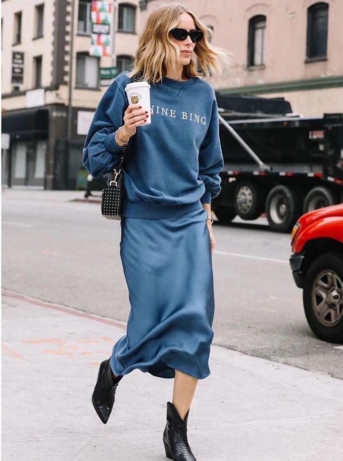 Satin skirt itself is very distinctive, so it is recommended that you avoid too many designed skirts and sweatshirts, otherwise it will look like you are trying too hard. , choosing a basic solid color model is simple and fashionable enough. If you are not good at matching, you can also start with matching the same color first. Matching the upper body and lower body in the same color can extend the overall body curve, giving a low-key yet high-end feel.