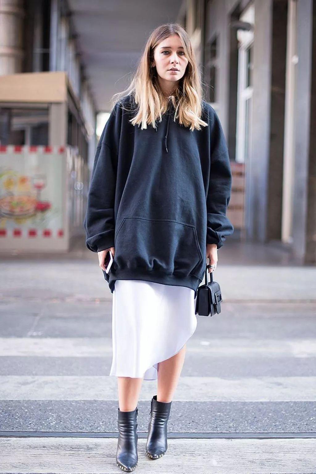 Sweatshirts are one of the most popular items nowadays, but due to their simple style, sweatshirts have become the most difficult clothing to wear well. If you want to look high-end, It is recommended that you don’t always pair it with jeans, which does look a bit mediocre. The sweatshirt itself is more casual, and paired with an elegant and feminine skirt, it can perfectly balance the soft and casual temperament, creating a strong and soft effect.