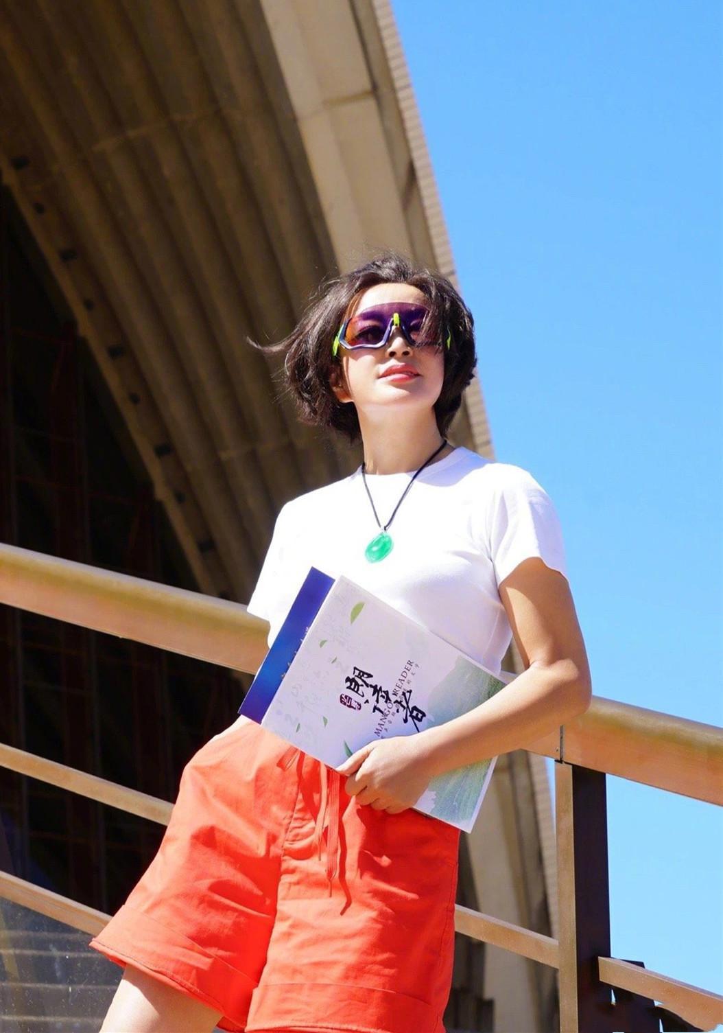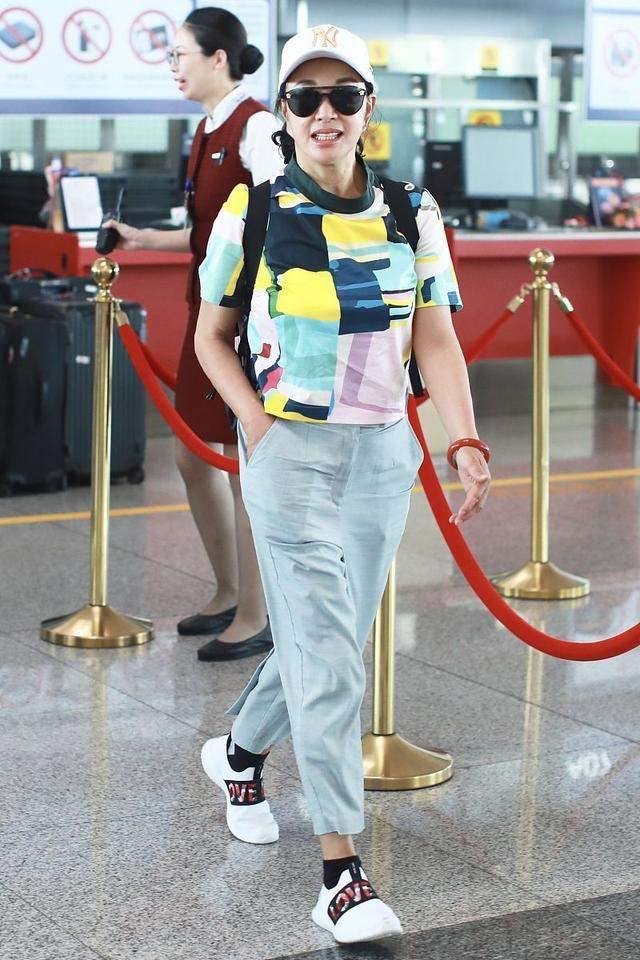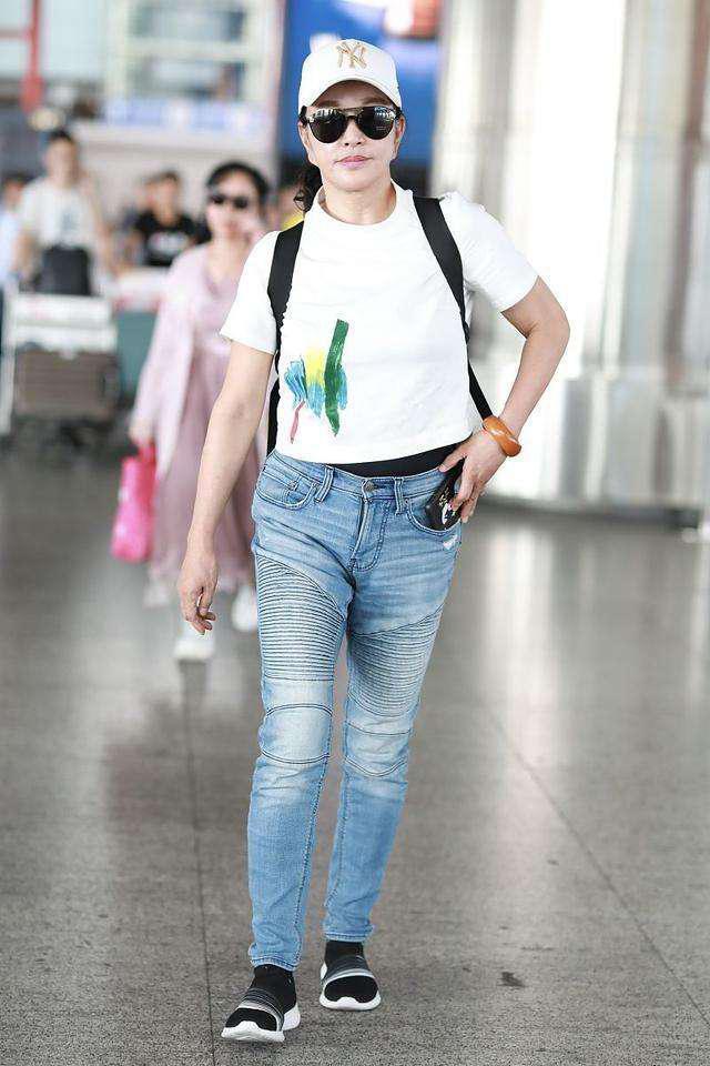 Liu Xiaoqing becomes more and more youthful as she gets older. Dressed in red and white, she is refreshing and eye-catching. She cuts her hair short to the ears and dreams of returning to her girlhood. Compared with pure white T-shirts, bright-colored T-shirts are more eye-catching, but skin color is still very picky. If your skin tone is not fair enough, you should try to choose a style with lower color saturation, which is less strenuous to wear. Not to mention Liu Xiaoqing is still very confident, boldly challenging the bright rose red color, which is very recognizable.