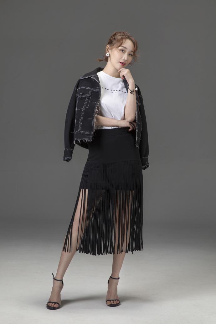 Most fashionistas will choose solid color T-shirts when trying the combination of T-shirts and suspenders, because solid-color items are easier to match. The addition of overly fancy elements not only avoids the complexity caused by mixing and matching, but also allows us to focus on the suspender items, thus highlighting the femininity. When Yuan Shanshan chose to layer a T-shirt and a suspender skirt, she used the most basic white T-shirt, combined with the sequined suspender skirt, to focus all the attention on the skirt, covering the flesh and making it more attractive.