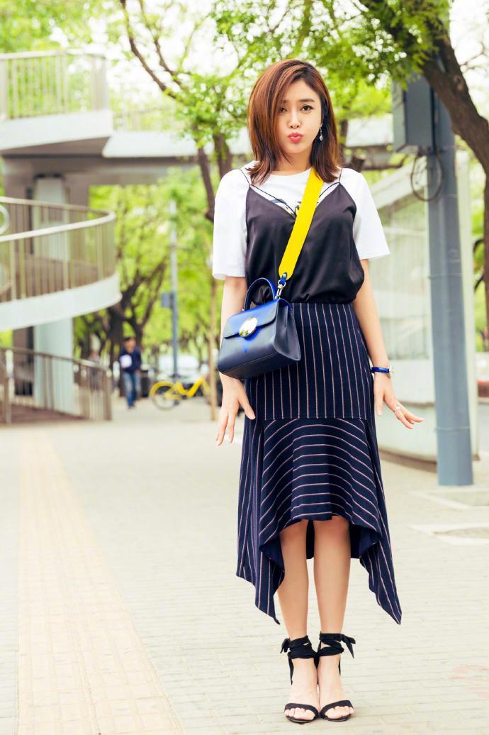 As we enter summer, many girls I began to wear suspenders, but some girls are not confident enough about their figures, so they dare not try suspenders with a larger skin area. At this time, we can use T-shirts and suspenders, which can not only cleverly cover the fat on the upper body, but also play with the rules of layering! Qin Lan chose a white T-shirt layered with black suspenders, which is both sexy and casual, and will not look inconsistent with daily matching.