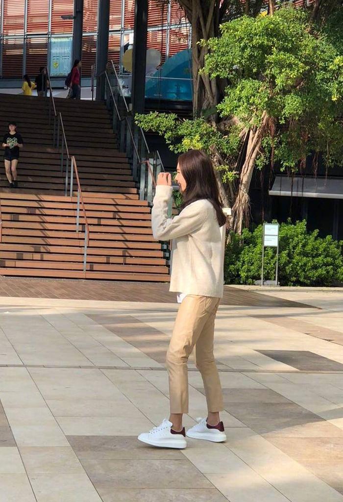Compared with bodybuilding pants, slim but not tight cigarette pants are more suitable for fat girls. Cigarette pants are actually pencil pants. Their shape slowly tightens from top to bottom, but the trouser legs maintain a certain distance from the skin, which can modify the shape of the legs. Choose high-waisted or nine-point styles. This style can also make your legs look longer and thinner, making it easy to highlight your simple and neat style. Gigi Lai wore a pair of nine-point cigarette pants in this look. The nine-point style only exposed her slender ankles. Simply paired with sports white shoes, it looks more casual and natural.