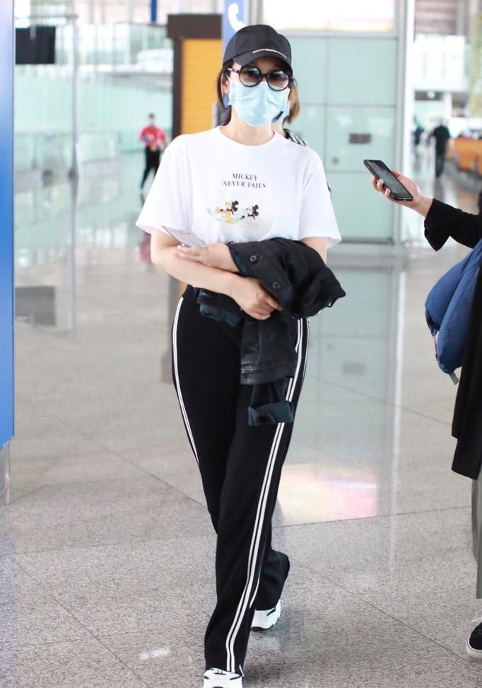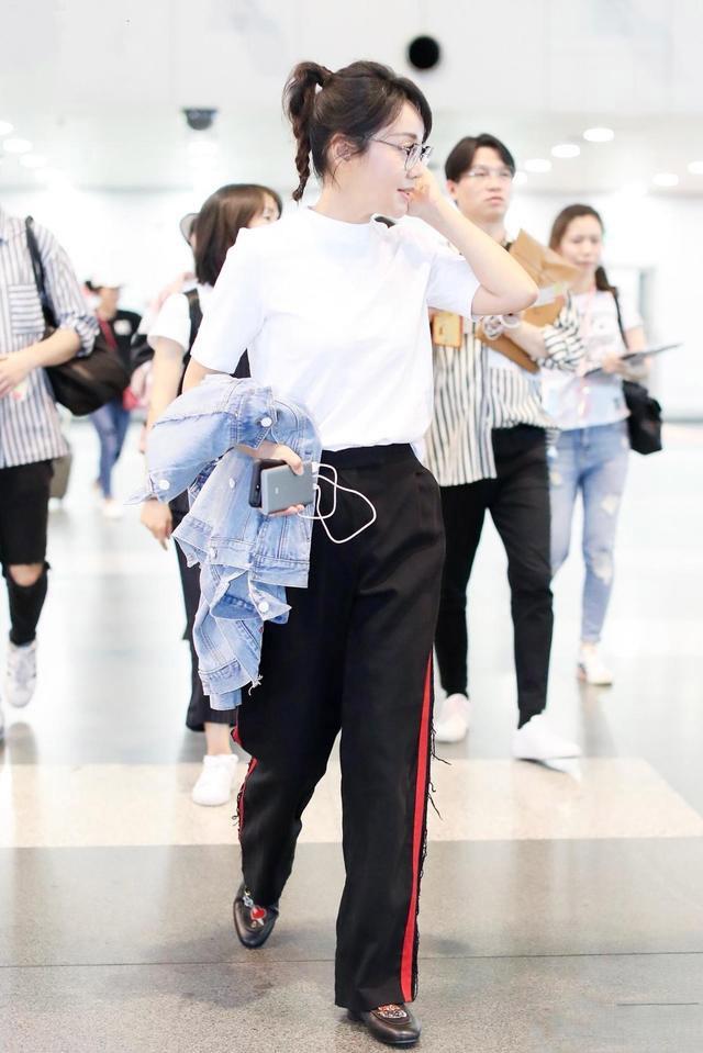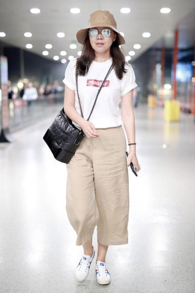Although Cartoon T has the greatest age-reducing effect, it is still too childish for some middle-aged women and does not match their age and temperament at all. , although the basic white T-shirt is very common, but when matched properly, it can also be full of high-end feeling. It is simple but not simple, and is suitable for women who are low-key, restrained and unobtrusive. Yan Ni has a similar combination in her airport outfit, pure white T-shirt with black wide t-shirt The leg pants are uninhibited and uninhibited. The red stripe design on the side just lightens the dark feeling of black. The basic color scheme is simple and elegant and will not go out of style easily. The ponytail is very lively.