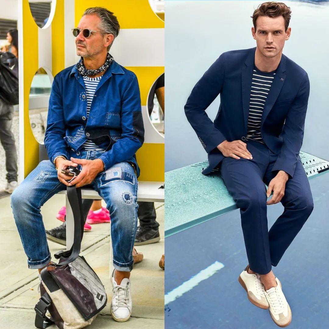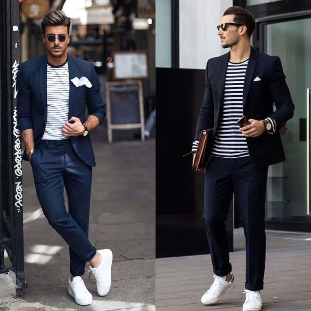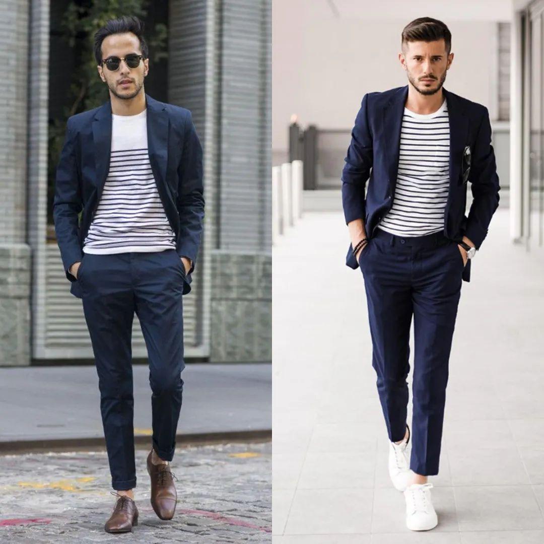 In spring, many friends like to wear a suit. In fact, there are not many choices for trousers as inner wear. Generally, shirts and white T-shirts are the most popular choices. Mainly, in fact, if you pair a blue and white striped T-shirt with a navy blue suit, the overall effect of the look is also very good. The classic blue and white tone looks very comfortable.