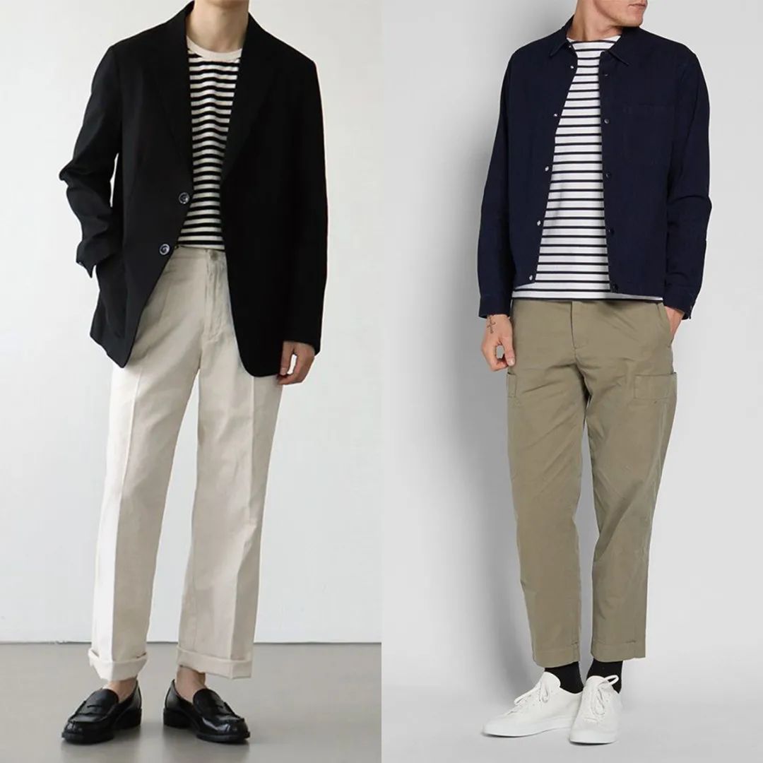 When matching, it depends more on your own needs. After all, everything from elegant gentleman’s suits to uninhibited denim jackets to retro literary work jackets can be perfectly combined with striped T-shirts.