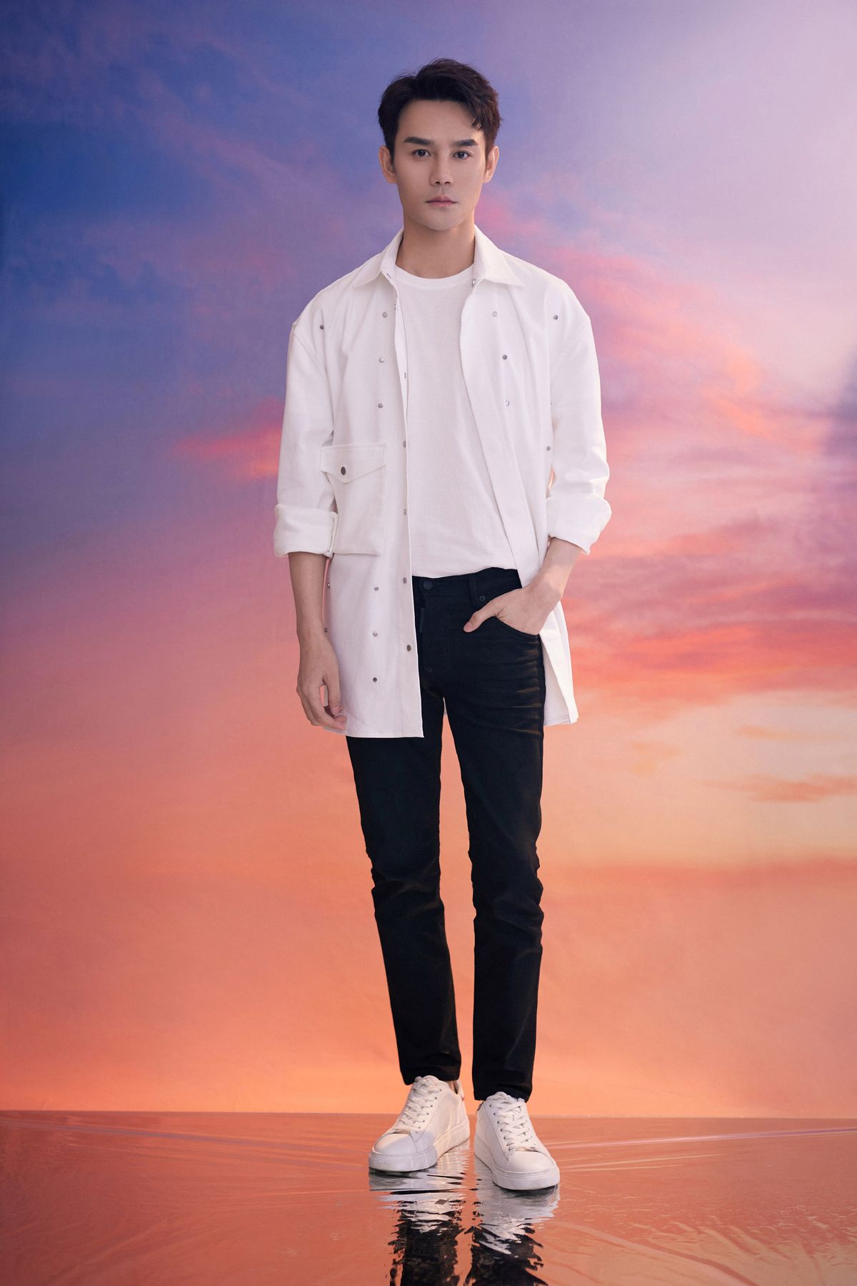 A flawless white solid-color shirt paired with slim-fitting trousers is one of the most youthful combinations. Simple color splicing makes the whole outfit look smart and handsome. As a jacket, a long-sleeved shirt can visually lengthen the body proportions. The elegant hem makes the whole person look elegant and steady, without looking old-fashioned at all.