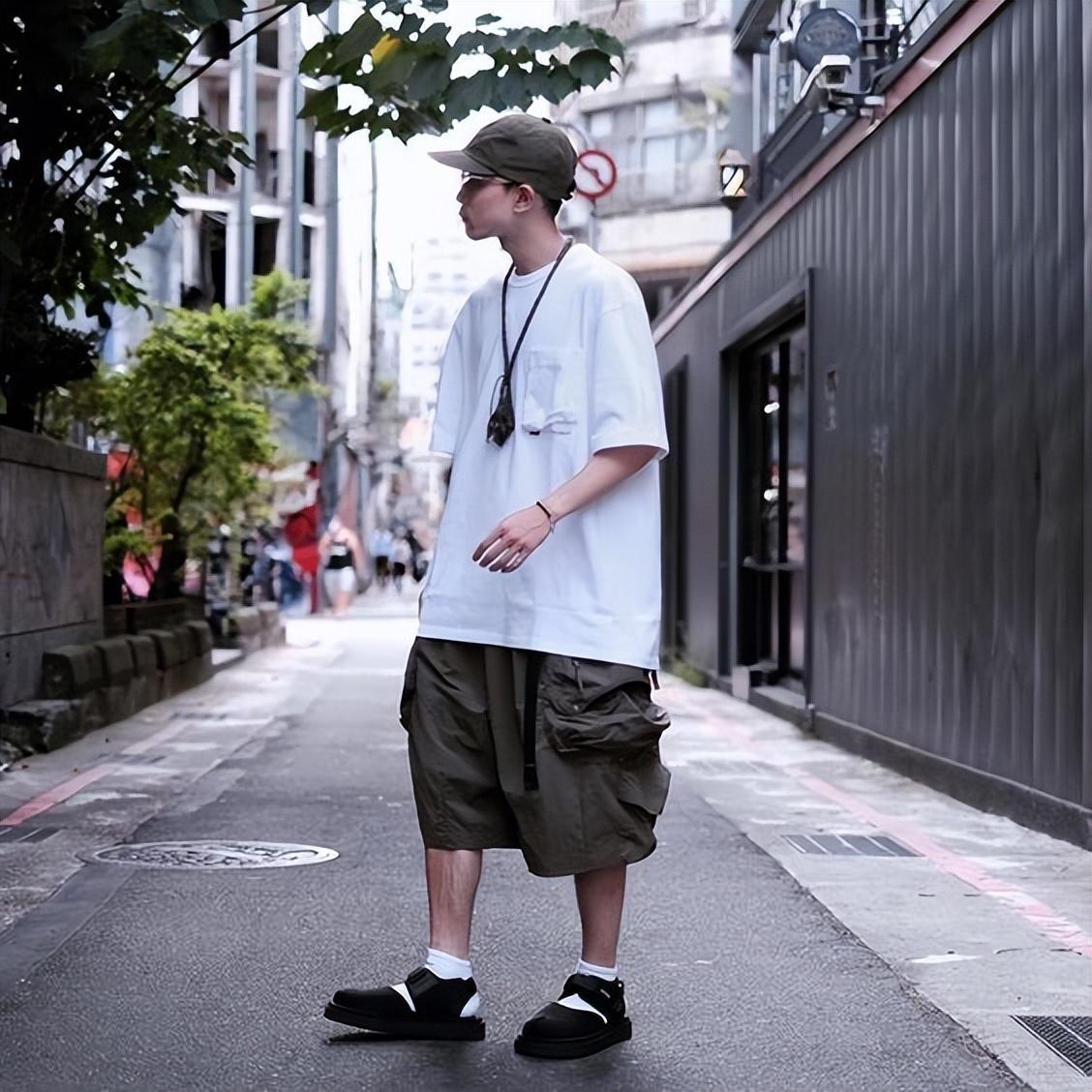 Choose dark-colored shorts, which are more popular for matching. In addition to not being picky, the style is also more versatile. A more designed T-shirt like this, paired with dark-toned shorts, is fashionable but not high-profile. College-style boys can refer to this type for daily wear. It is relatively easy to match, and the single item is also good. Very fashionable and avant-garde, without a trace of earthiness.