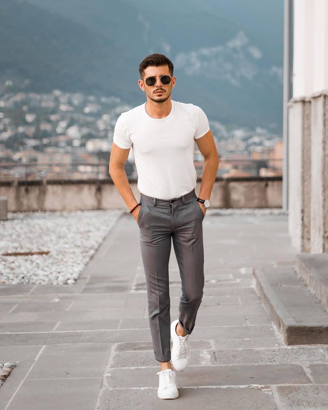 Pair a white round-neck T-shirt with a pair of high-waisted gray trousers. The fitted version perfectly reveals the overall line. If you are a man with a relatively strong body, , you can also choose a slightly looser version.