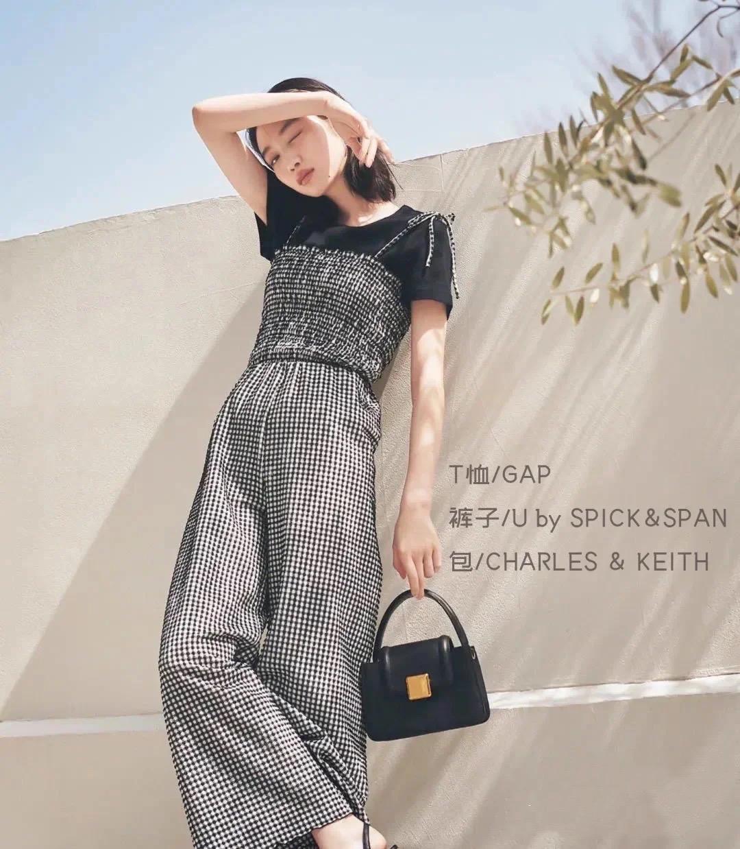 The black T-shirt, relatively slim style, paired with the houndstooth suspender skirt, gives people a particularly delicate and slim feeling. This kind of overalls with thin straps is especially suitable for girls with thin skin. They look lighter and slimmer when worn.