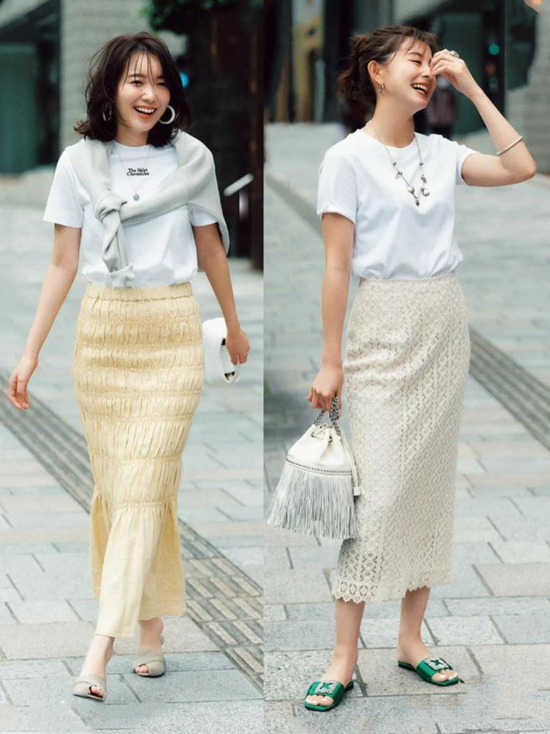 Knee-length skirts that cover the hips can be more charming and feminine. Women in their thirties and forties are in their prime, with plump and straight figures, and are particularly suitable for this kind of hip-hugging skirt, worn with a white T-shirt, which is refreshing and elegant.