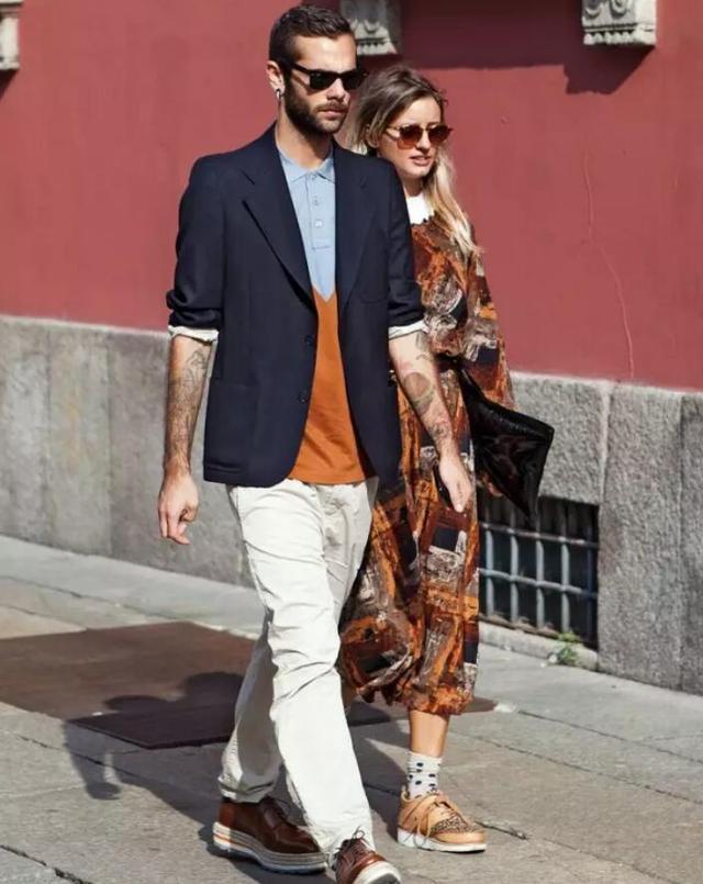 The strong contrast between the suit jacket and the half-orange and half-blue POLO shirt is both gentlemanly and elegant, which is perfect Outfit model!