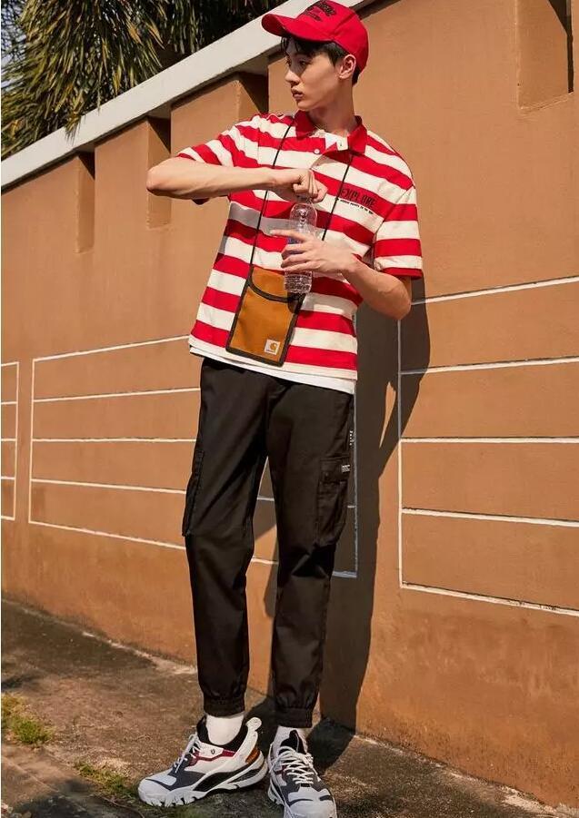 Pair a red and white striped POLO shirt with overalls, which not only has the warmth of summer, but also has a sense of fashion.