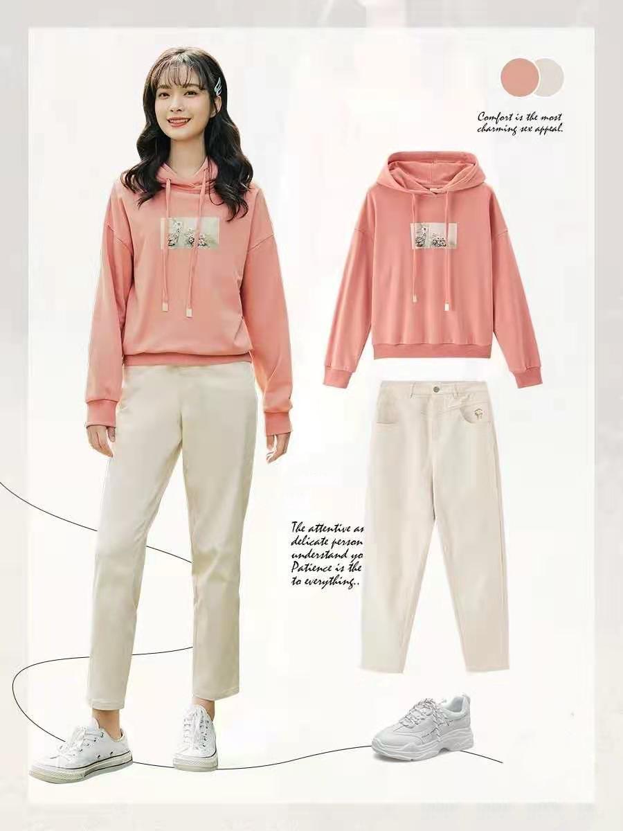 The pink hooded sweatshirt is still matched with the ordinary style just now, using white casual pants to weaken the childishness of the pink and let the overall look shine out. The scent is youthful and sweet. The visual sense of matching items with girly style is still very obvious. A pair of canvas shoes or sports shoes are a symbol of youth.