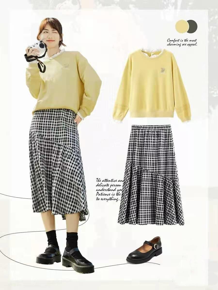 Youth is meant to be released. Fresh and bright colors combined with casual sweatshirts are a big hit, giving people a new visual experience. Solid-color sweatshirts are relatively monotonous, so you can occasionally add a little “thought” to the design. Add a playful fungus collar, and it looks quite artistic when paired with a plaid skirt.