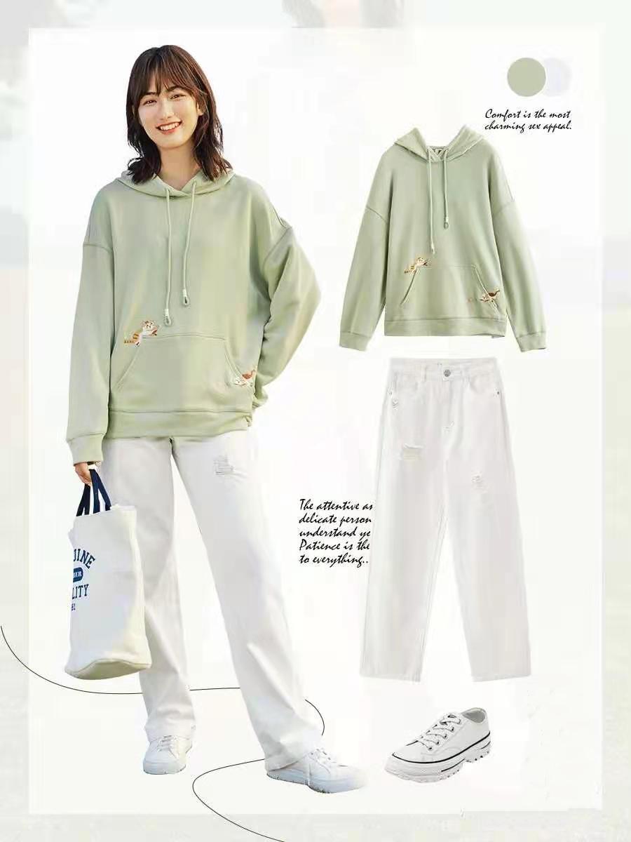 The hooded sweatshirt is also a relatively classic style. The addition of a hood design makes the sweatshirt more casual. Usually sweatshirts are of a relatively loose fit, with tops and bottoms tight, which can reveal your good figure.