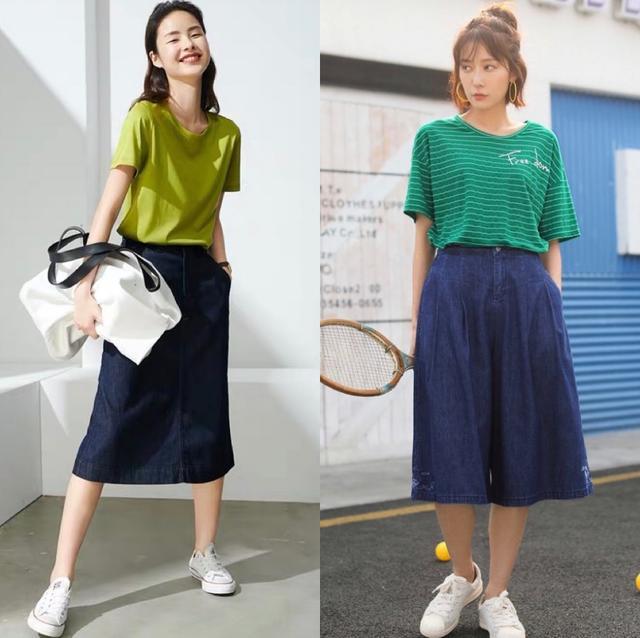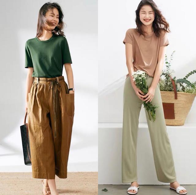 If you choose a dark-colored T-shirt top, you must consider your skin color and avoid dull and dull black, etc. The key is to choose dark green, haze blue, camel, etc. that can complement your skin tone. In summer, T-shirts in these colors look comfortable and are very popular among fashionable people. For example, pairing a dark green top with caramel-colored wide-leg pants creates a very handsome, eye-catching and stylish look, helping you achieve fashionable chic easily!