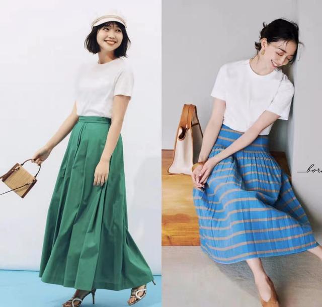 If you are a slightly older woman, you can choose a more calm and elegant skirt color, such as simple and elegant An earth-colored skirt paired with a white T-shirt is a very popular color combination, showing a gentle charm. If you want to be more eye-catching, you can choose a brick red skirt. This color scheme is also quite charming.