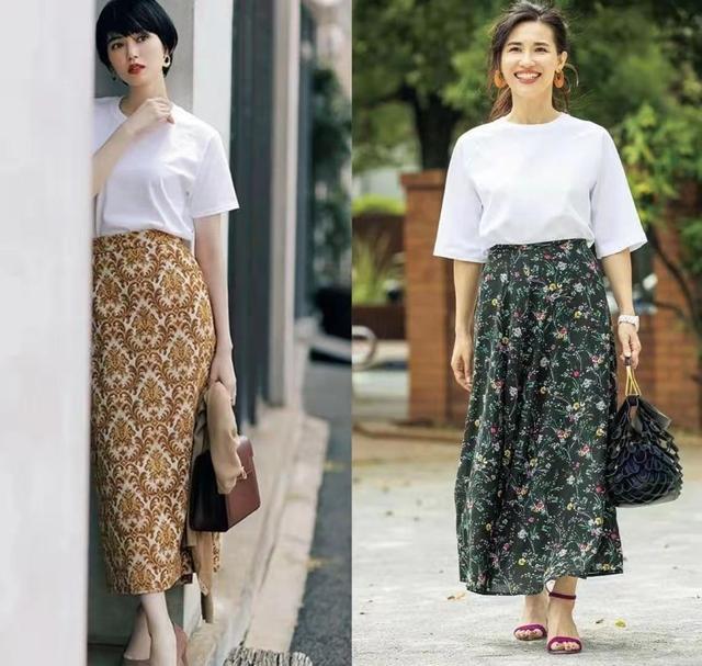 It should be said that the most common skirt is naturally indispensable with printed patterns, which is very in line with the current atmosphere. As shown in the picture above, choose a white T-shirt paired with a ginger printed skirt. The straight version has a good effect on modifying the shape of your legs. It allows you to have a good figure and be more gentle and high-end. It can also be an elegant green printed skirt, made of light chiffon fabric, to demonstrate an elegant style.