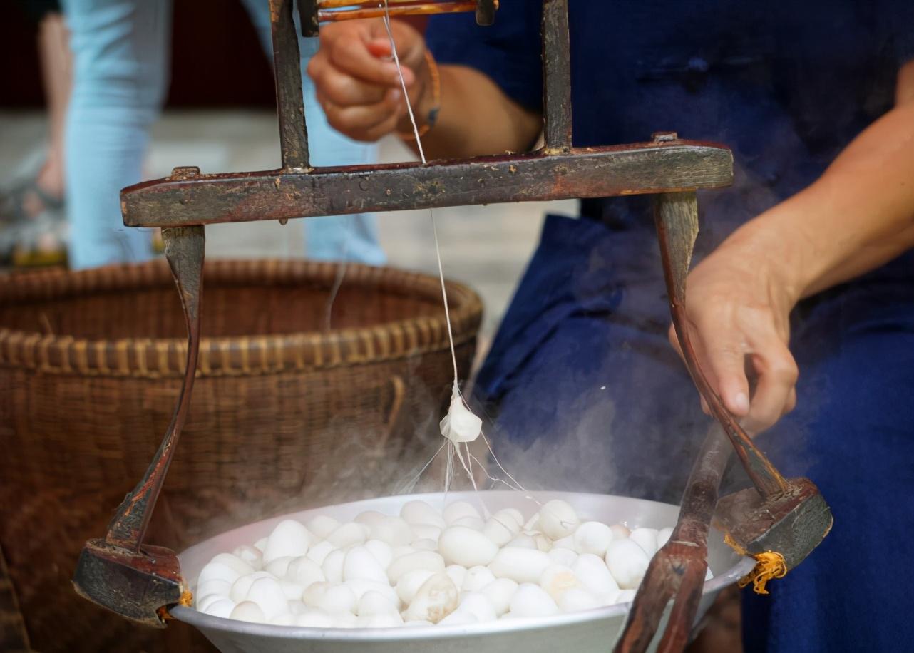 The next step is to wash these silk threads with warm water to remove the residue of melted protein. After that, they are woven into cloth, dyed in various colors, and made into various silk products.