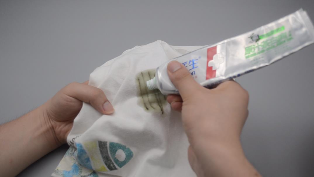 The second step is to squeeze the area where the marker marks are on the clothes. Toothpaste from the previous section. Because toothpaste contains abrasives, it has a certain cleaning effect.