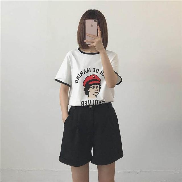 The gentle white color looks very comfortable. Made of pure cotton, the texture is skin-friendly and soft. The portrait print and loose fit make this T-shirt very eye-catching despite its simple design. It goes well with a simple A-line skirt, which can easily create long legs.