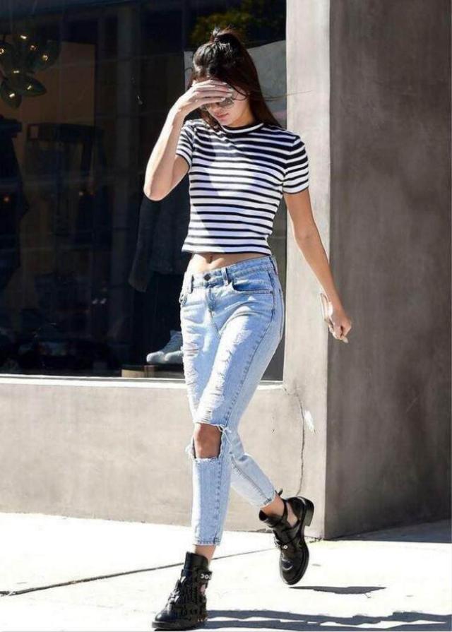 Slim-fitting T-shirt, very flattering. With a proud figure, wearing a slim-fitting T-shirt can attract a lot of envious looks. The combination of stripes and denim is eye-catching.