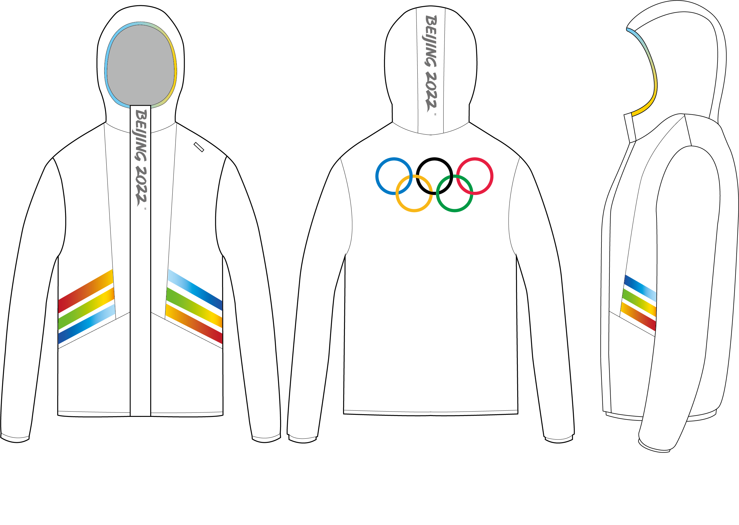 Guo Yucheng introduced that the design of this set of work clothes revolves around “Beijing and the Olympics”. The color of the clothes is a large area of auspicious white, with the front placket printed with the “BEIJING2022” Winter Olympics text and graphics as the visual central axis. The three slanted rainbow stripes presented symmetrically on the sides show the upright beauty unique to Chinese design.